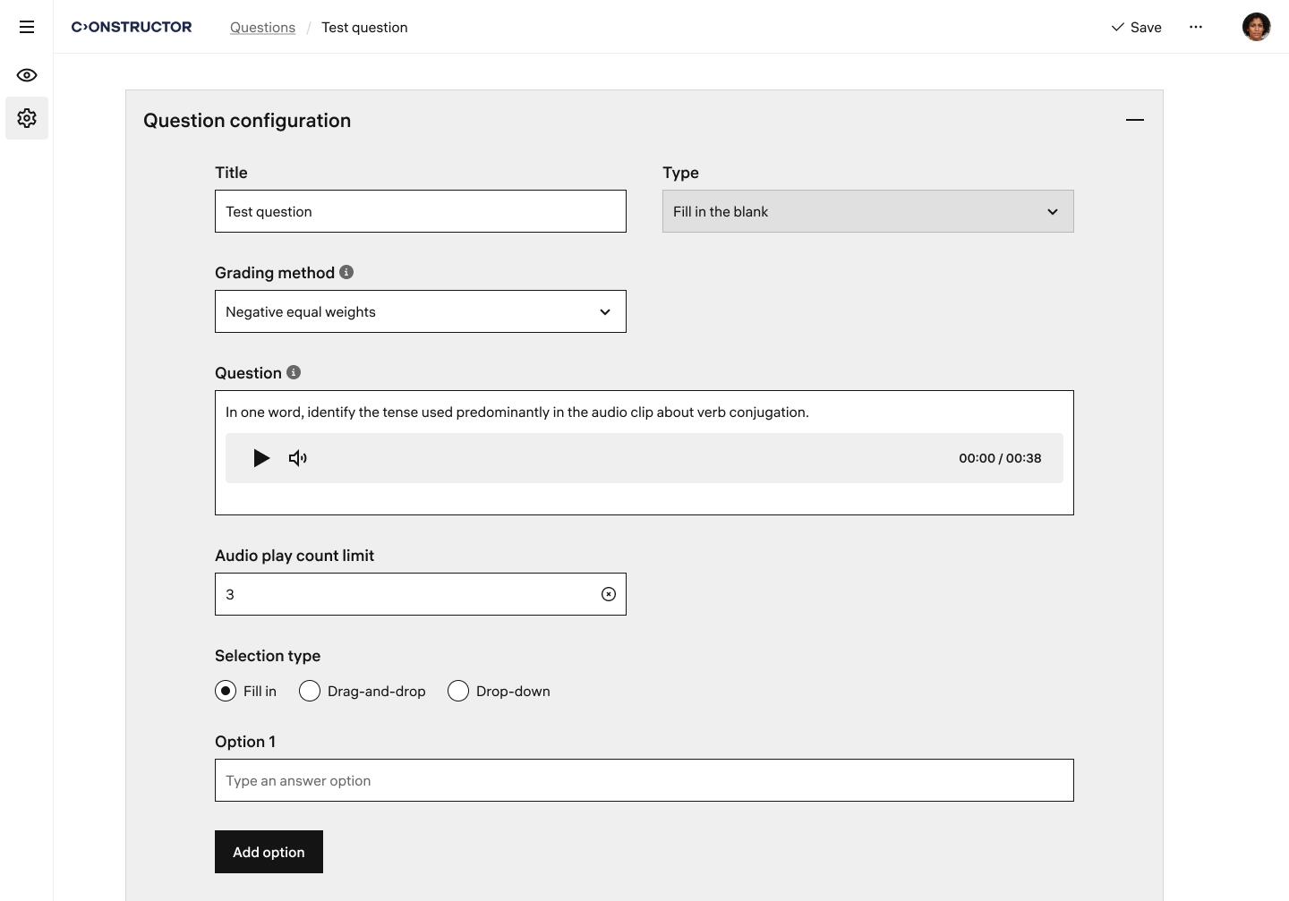 We've added the ability to set a limit on the number of times an audio file can be played. Quiz authors can specify this limit when creating or editing a question. Learners are informed about the available number of plays and cannot play the audio anymore after they have used all the attempts.