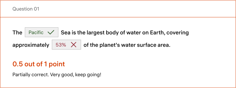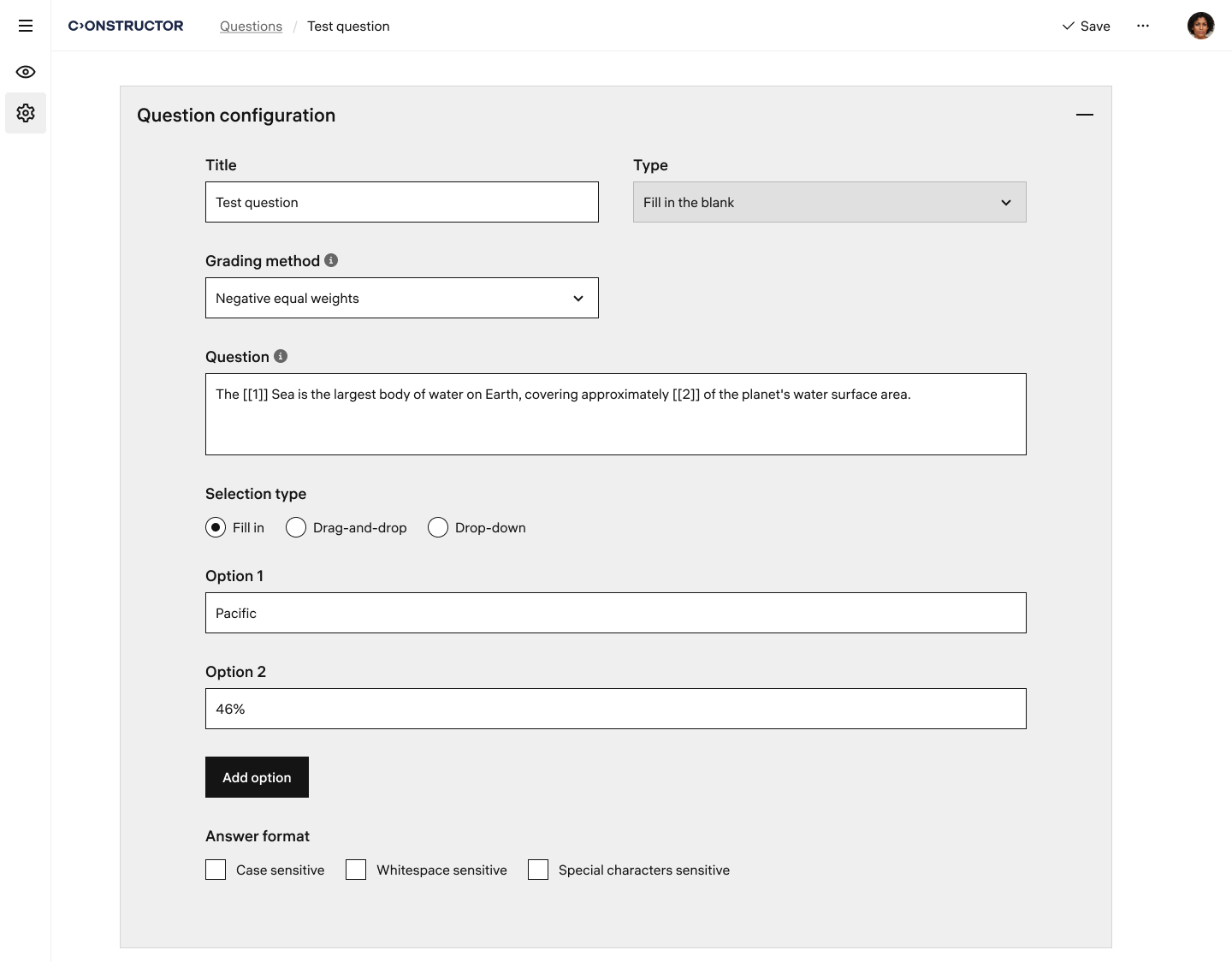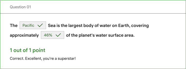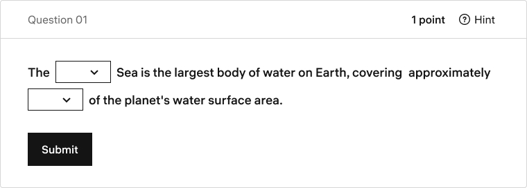Now authors can add the Fill in the blank questions with the “Fill in” subtype when creating or editing a quiz. This allows for a more extensive and thorough assessment of learners’ knowledge. This question type contains blanks in a sentence or definition that the learner must fill in with the correct answer. Authors can move, delete, or modify questions of this type in quizzes.