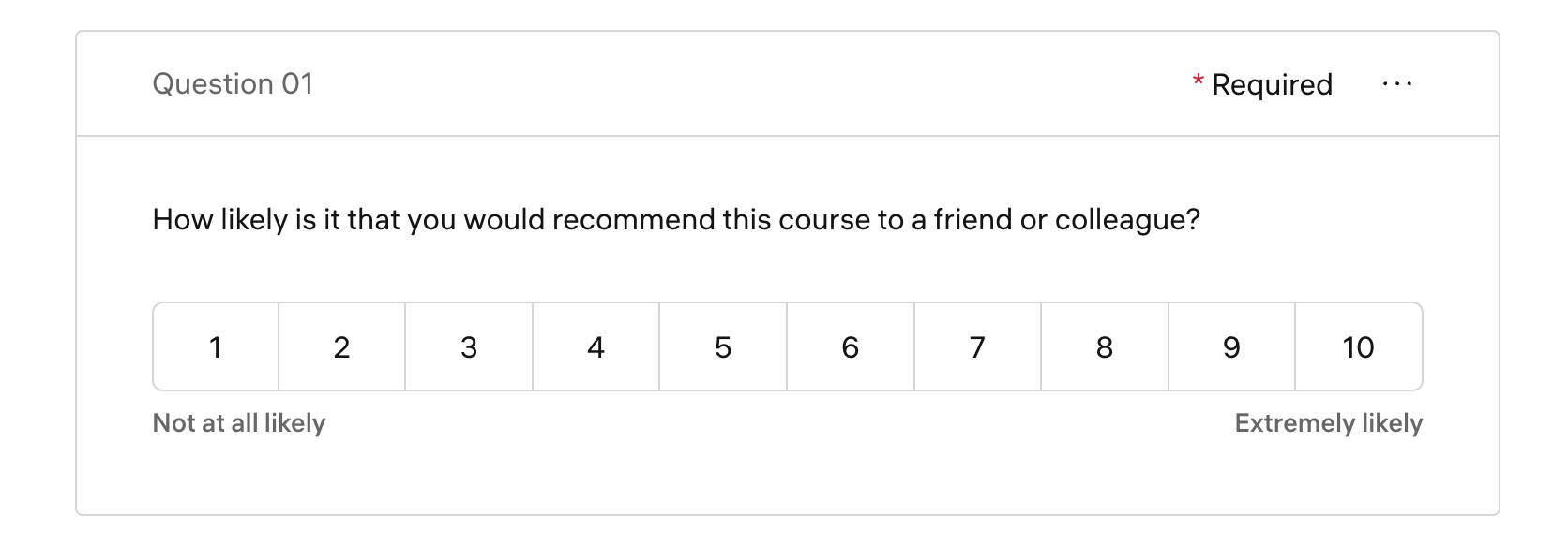 This question type includes a numerical scale, allowing respondents to rate their level of agreement, satisfaction, or other metrics. Authors can set the lowest and highest points of the scale and provide labels for them.