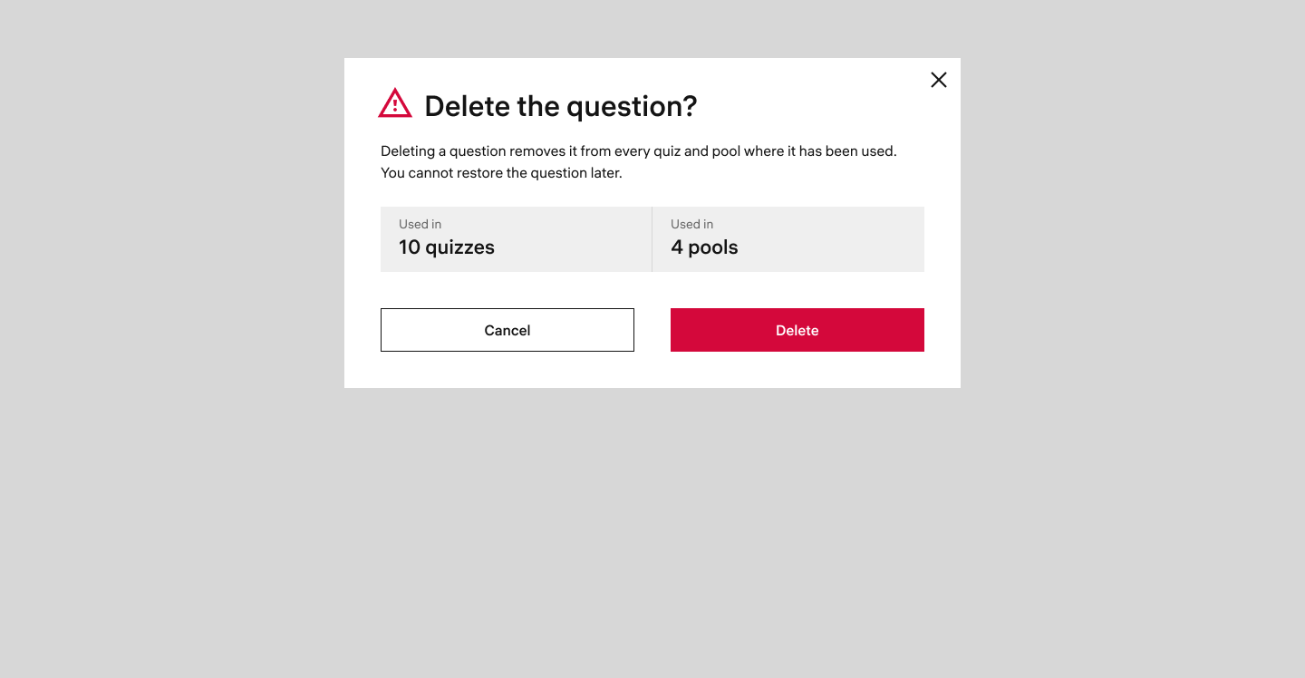 When a user deletes a question from the Question Bank, it is automatically removed from any quizzes and pools where it is used. The system now informs the user how many quizzes and pools the question is used in before deletion.