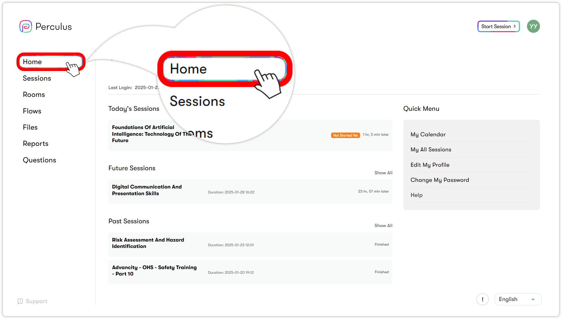 My All Sessions: Opens the sessions page, where you can view all your sessions in one place.