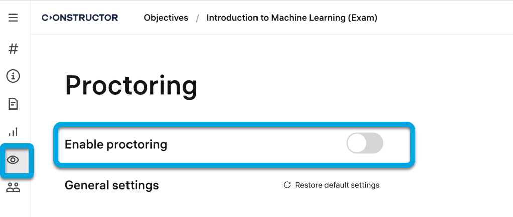 You can enable proctoring for quizzes or exams in a course. In this case a learner will be monitored either by a human proctor or with the aid of Artificial Intelligence while taking the exam or quiz.