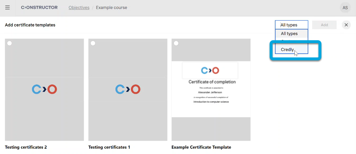 Constructor Learn supports issuing certificates with Credly badges.
