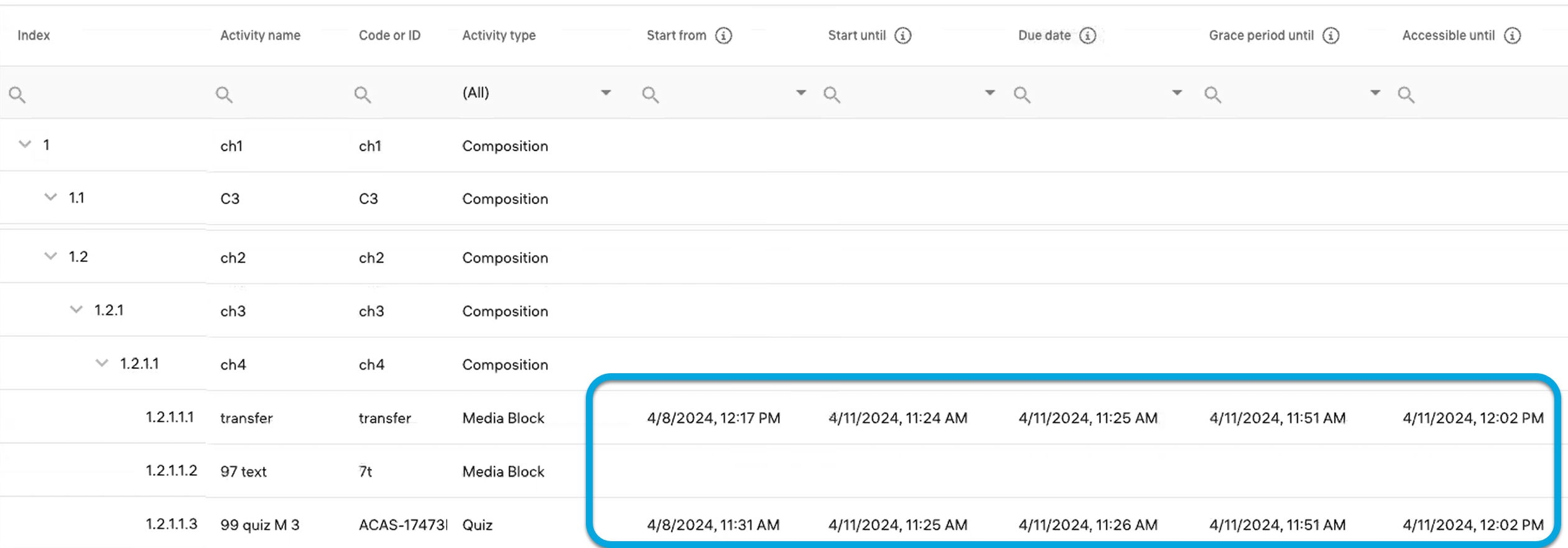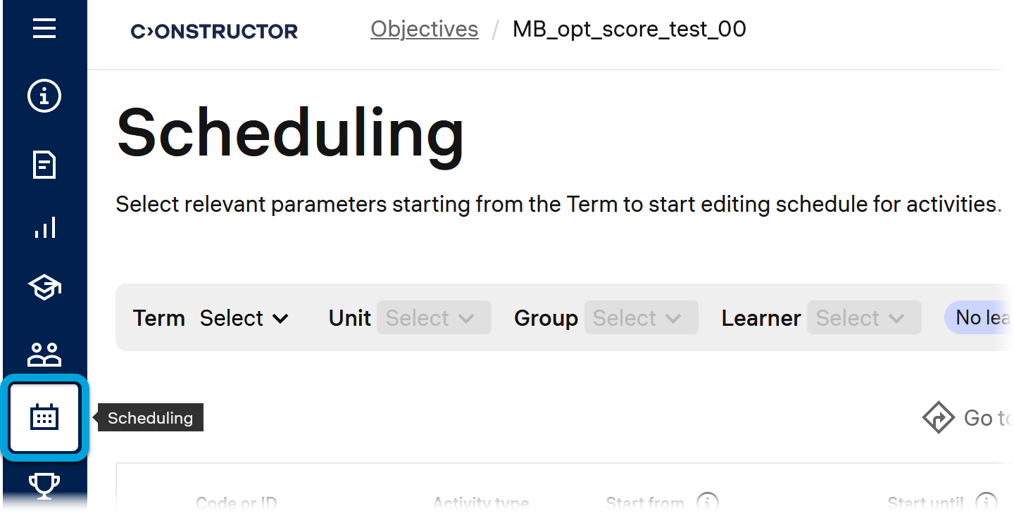 In the Scheduling menu of a course (or program), you can specify when individual activities in the course become available to specific learners and groups, as well as define the actions permitted during these periods.