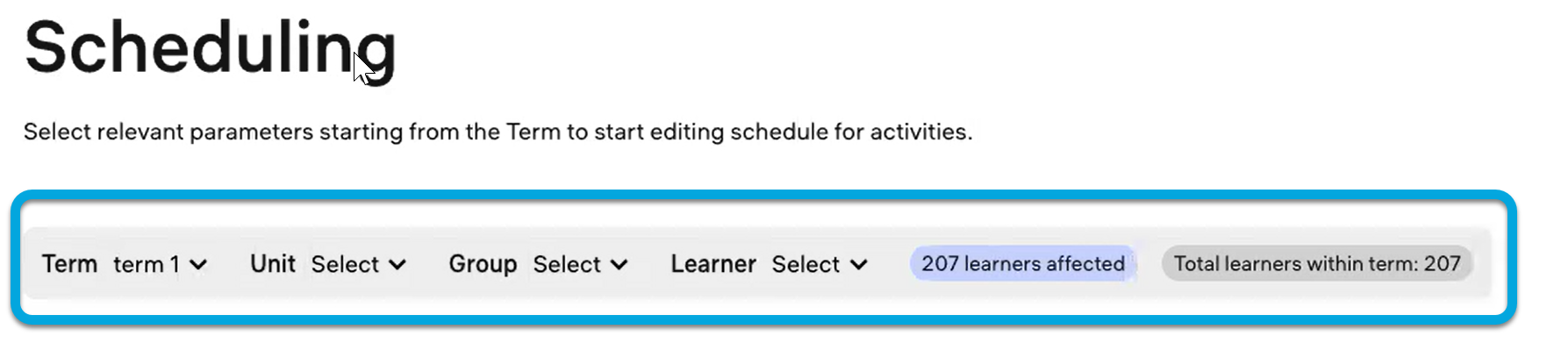 By default, activity availability settings are derived from the academic term associated with the course's enrollment (see Enrolling learners for courses). With the Scheduling menu, you can customize these settings. For example, you can extend access to an activity for a learner or group, or adjust dates as needed.