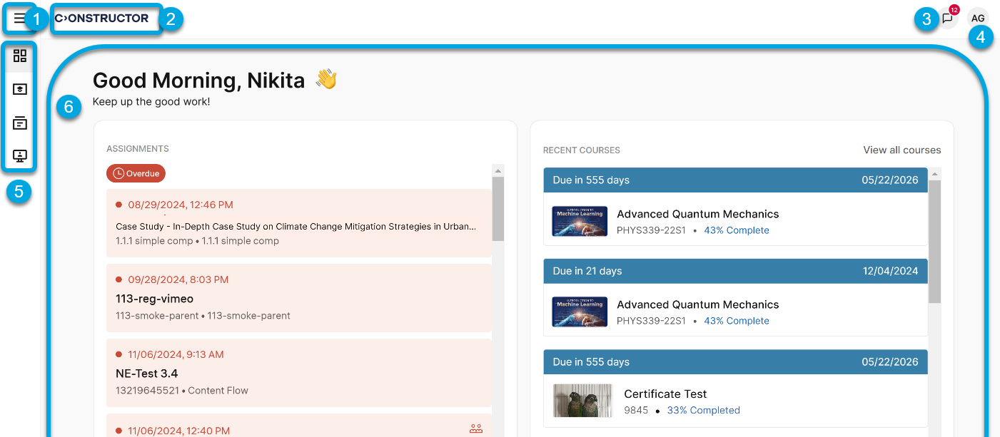 According to the numbers in the screenshot, the Constructor Learn UI has these main parts: