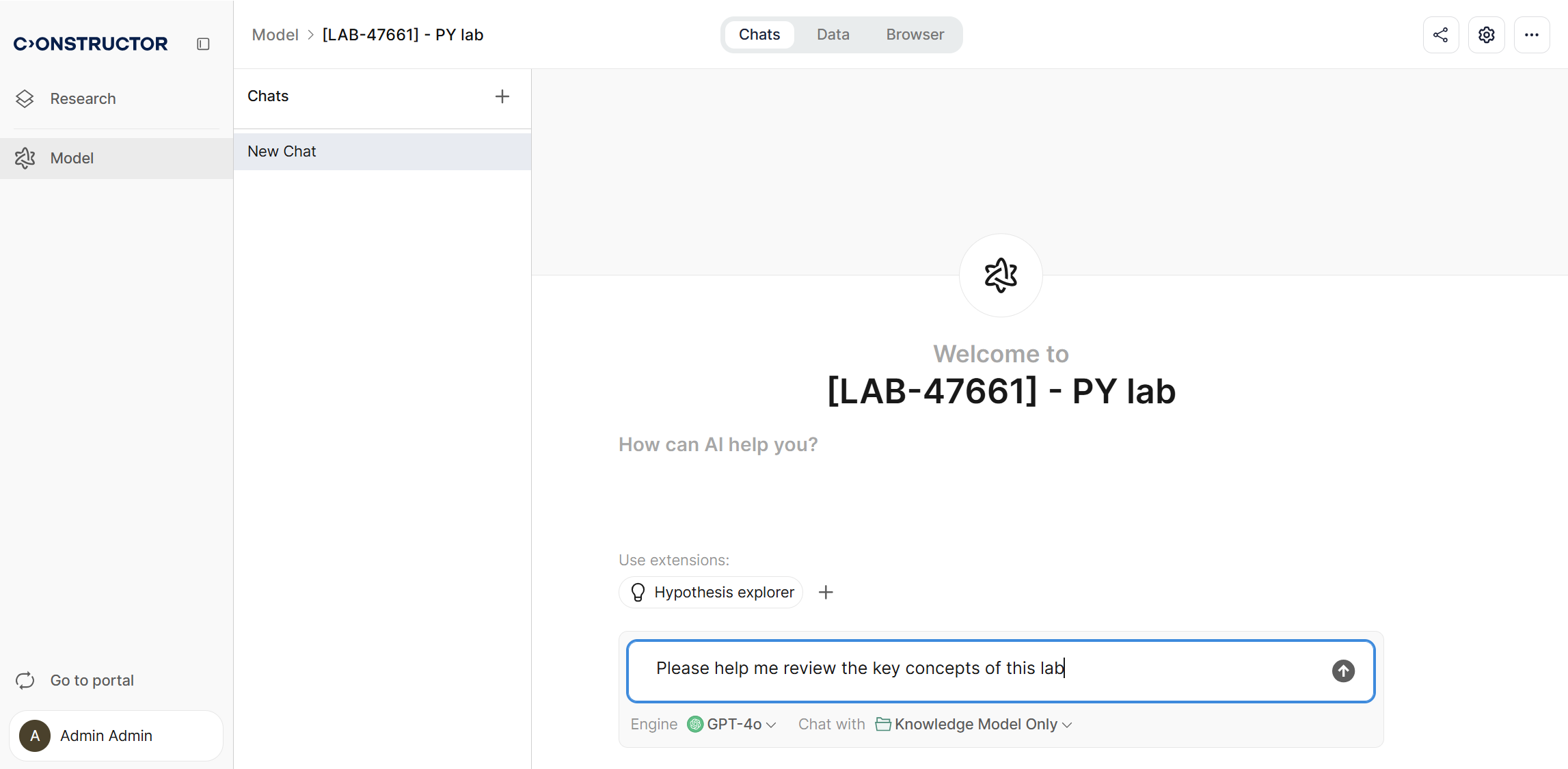 On the Chats tab, start chatting with the model by opening a new chat or continuing a previously created one.