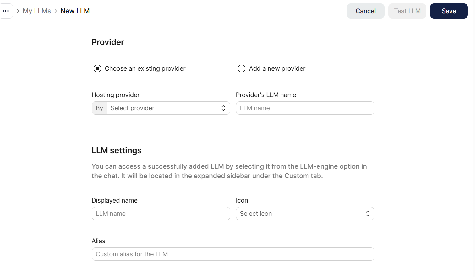 Add a custom LLM by providing your API key and other necessary parameters. This feature allows you to use your preferred LLM directly with our Knowledge Model functionality.