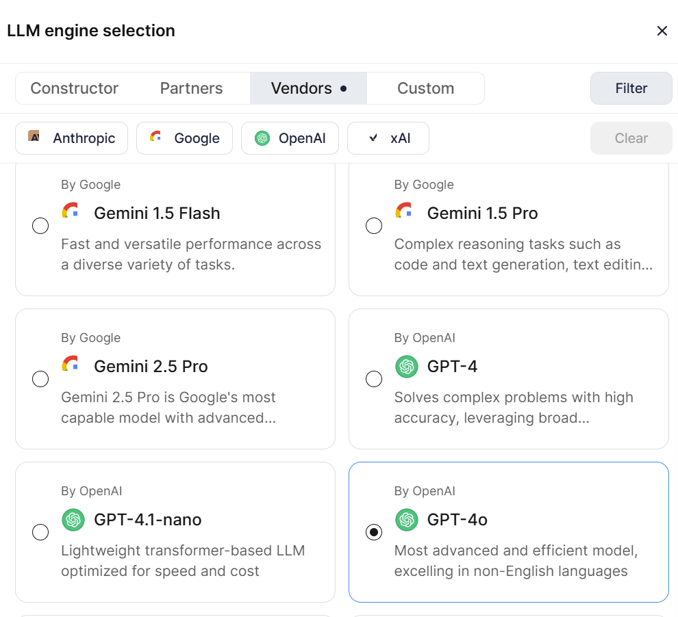 You can now connect your own Large Language Models (LLMs) to Constructor Model.