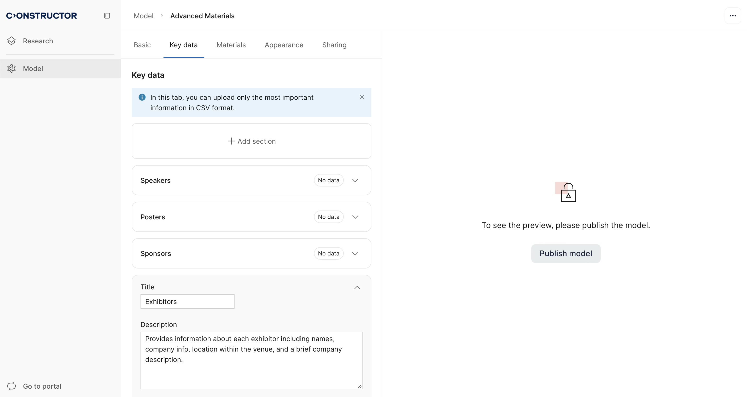 The chatbot is configured using tables with conference-related information, which serve as the model’s primary data sources. Files with over 1,000 rows are supported and can be updated or replaced without rewriting their descriptions.
