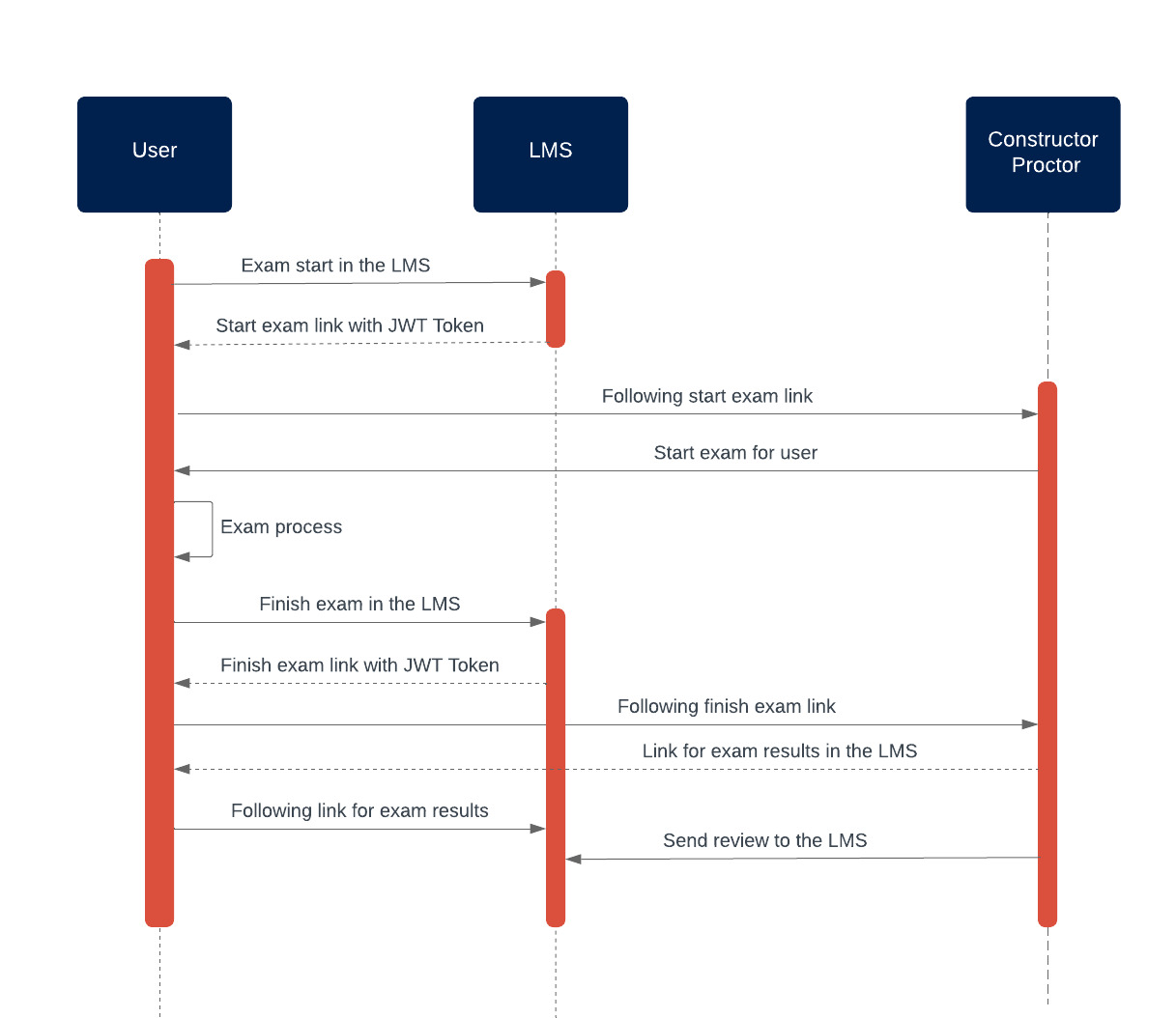 The diagram below depicts how API integration between an LMS and Constructor Proctor works: