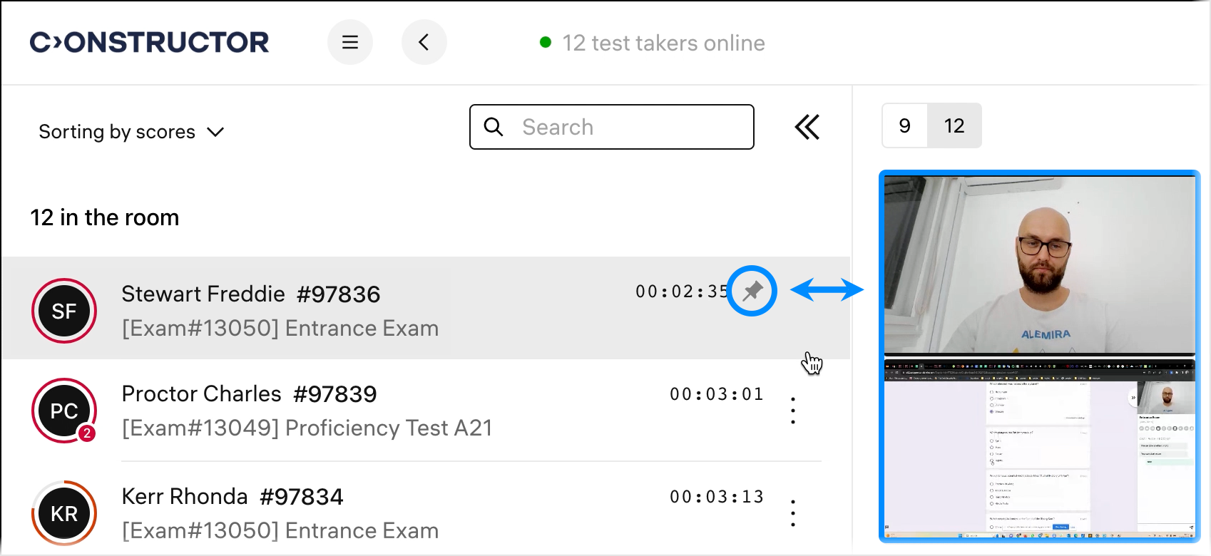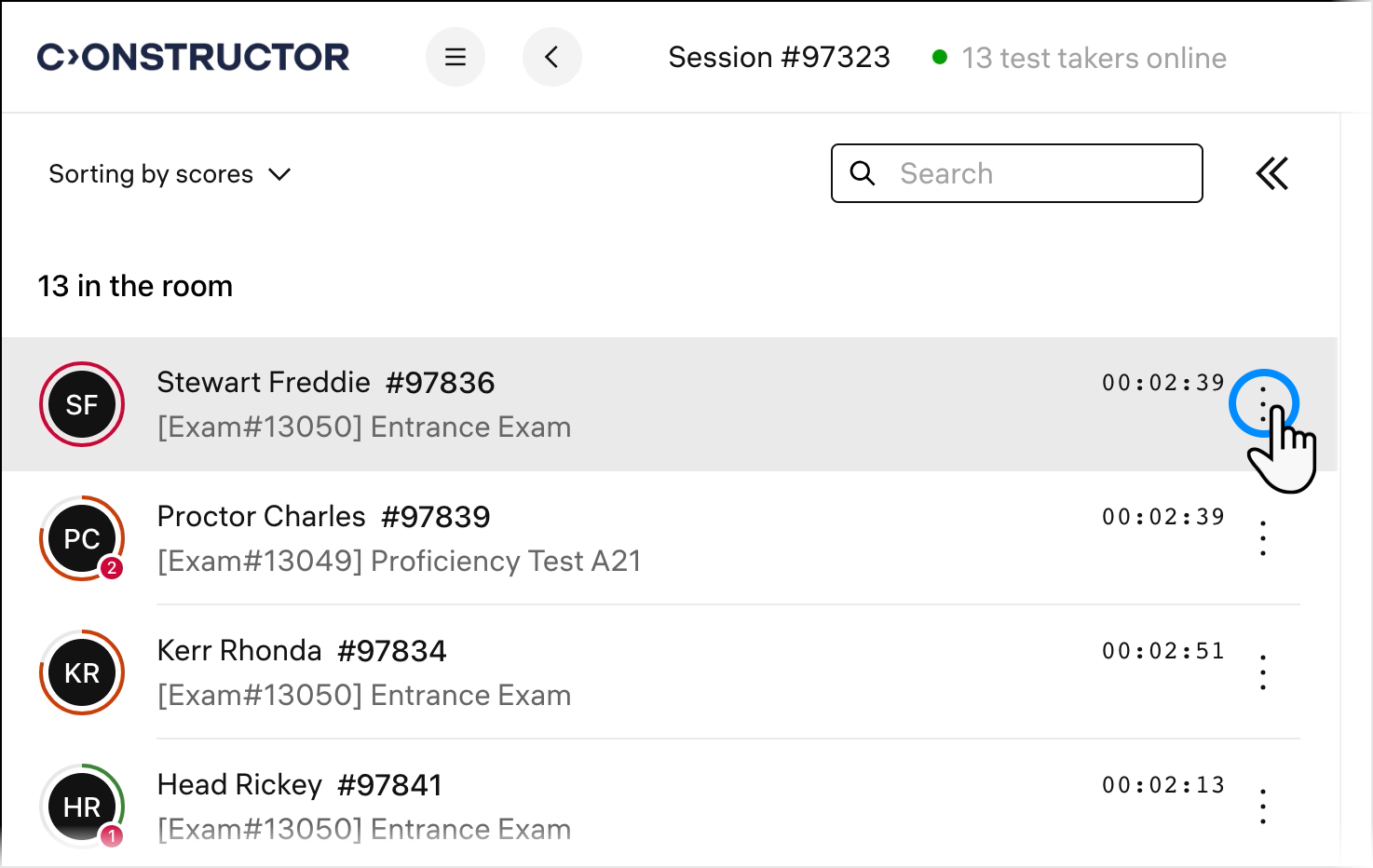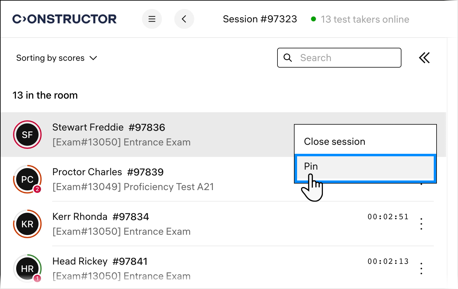 If you're unsure about the behavior of one of the examinees, pin them to the top of the user list. It will make it easier for you to keep track of their actions. Click on three dots next to the session timer for the person: