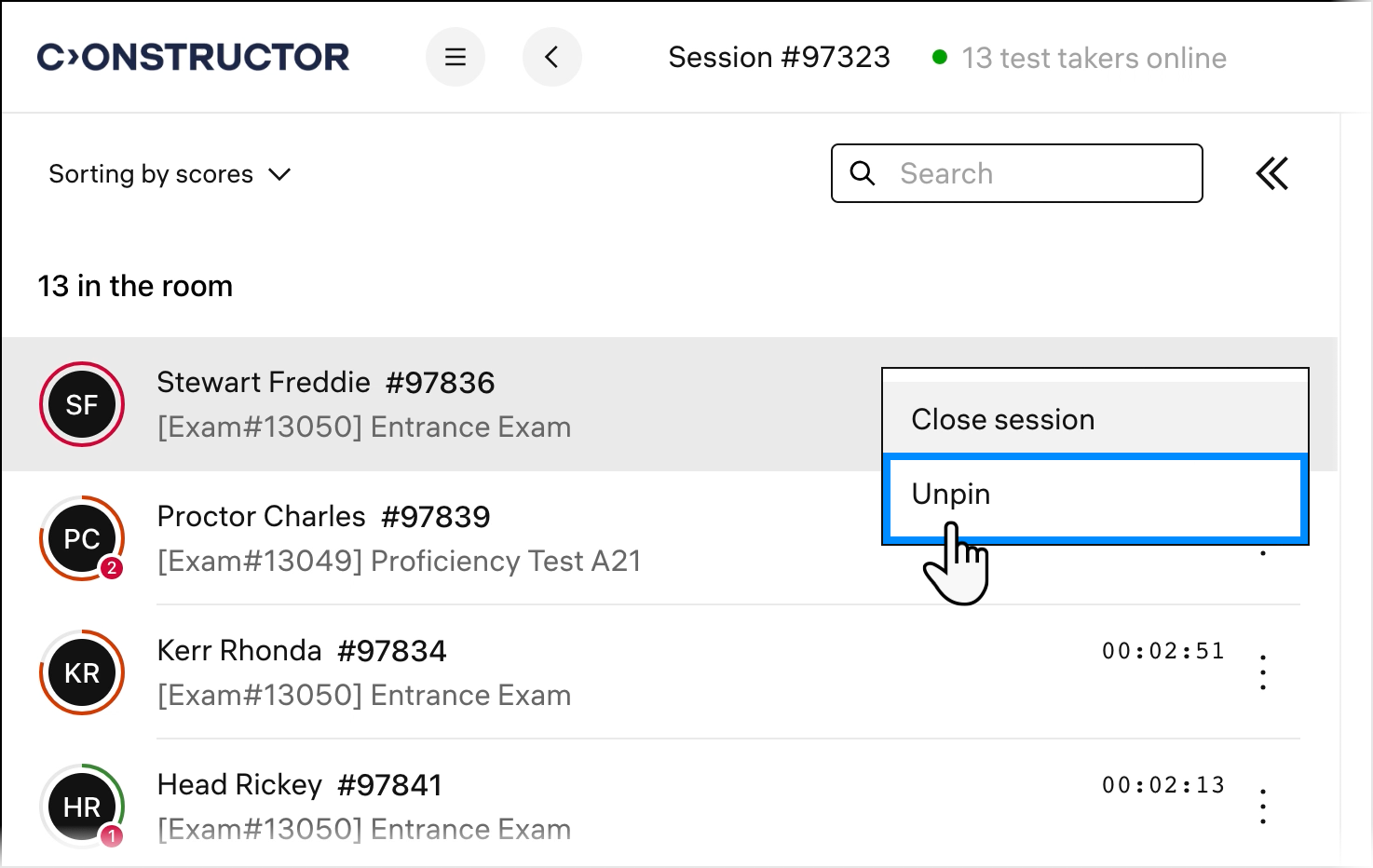 You can pin multiple examinees. To unpin a pinned test taker, click the three-dot button and select Unpin: