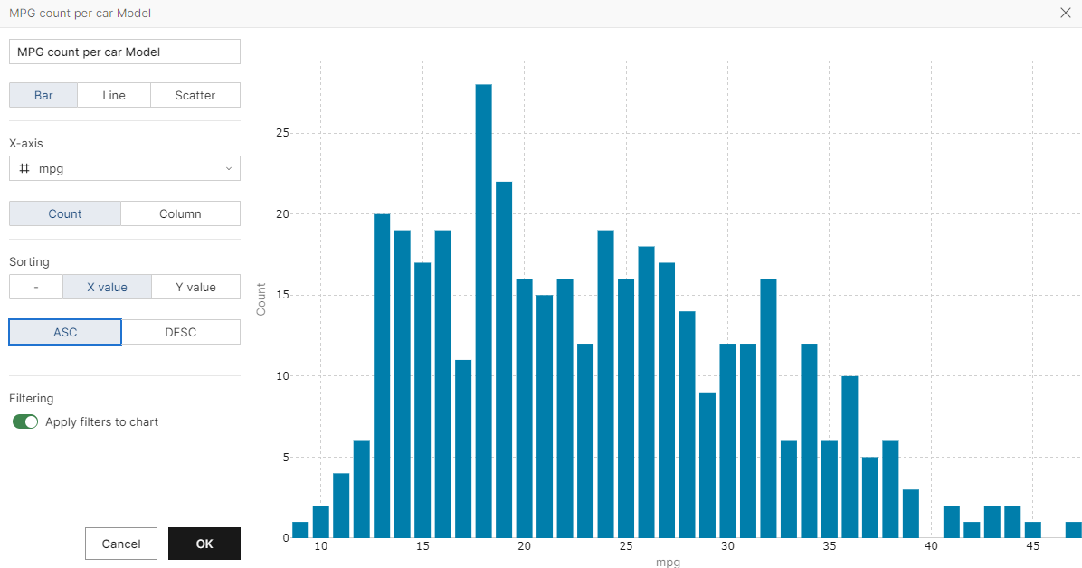 When plotting a chart in the Data Catalog, users can now sort X-axis values based on total aggregation function values for the Y-axis. They can apply either ascending or descending sorting in the chart settings or revert this setting if needed. This option allows for a more flexible chart configuration.