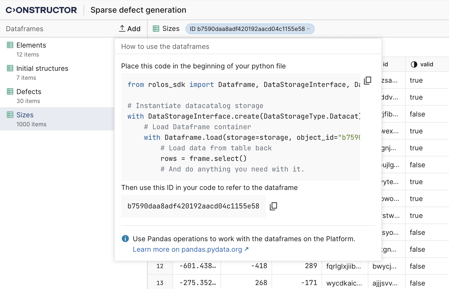 Now users can reference their dataframes in the Data Catalog from the scripts. This enables programmable dataframe data reading and manipulation. Each dataframe has an ID that can be used in a script, notebook, or workflow to access this dataframe directly, without copying its data to some intermediate structures. Additionally, code snippets from dataframes can be pasted directly into scripts. These enhancements save processing time.