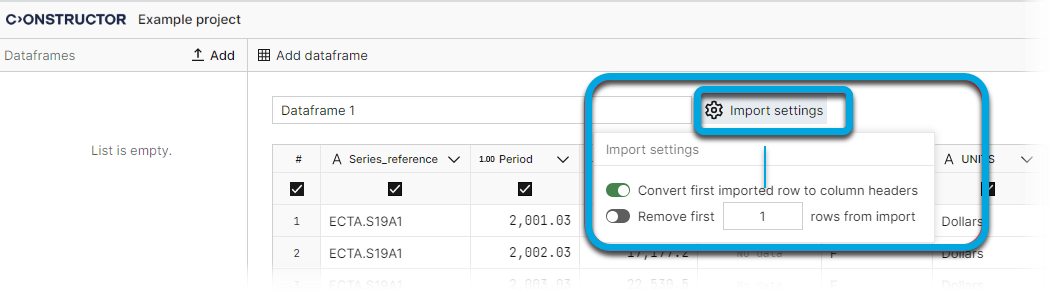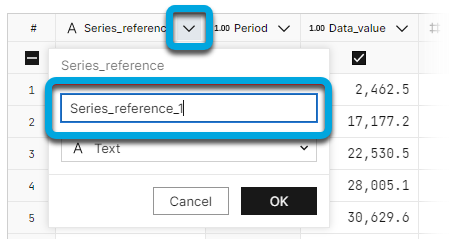 | Information | In the preview mode (until you confirm uploading a dataframe) only up to 30 rows of a dataframe are displayed. |