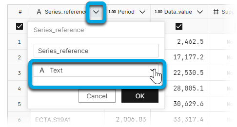 | Information | If the data type does not correspond to the column contents, there will be the "No data" error highlighting. |