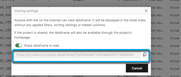 You can make a dataframe from your project publicly available to everyone who has its URL. To do it:
