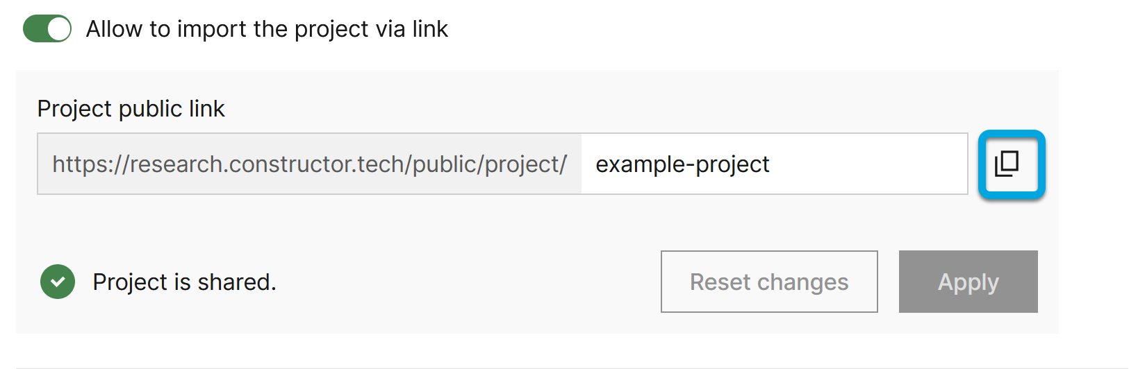 You can copy the URL link to the clipboard. The project becomes available to all users having this URL with all its public publications and public dataframes.