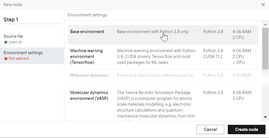 A project workflow is depicted by a graph that consists of ordered nodes. Each node represents a step in the workflow. Each node must contain at least one executable file and one virtual environment in which to run this file.