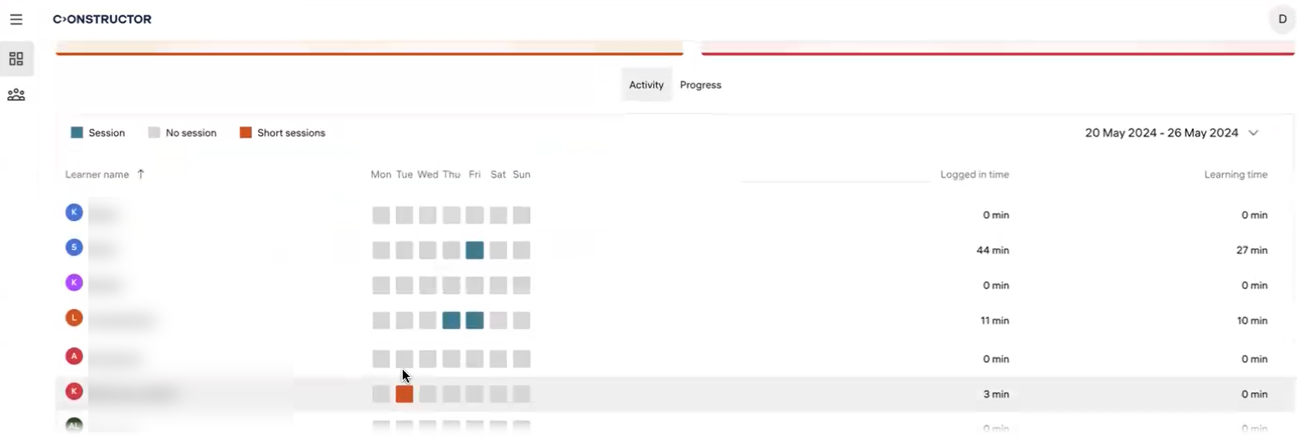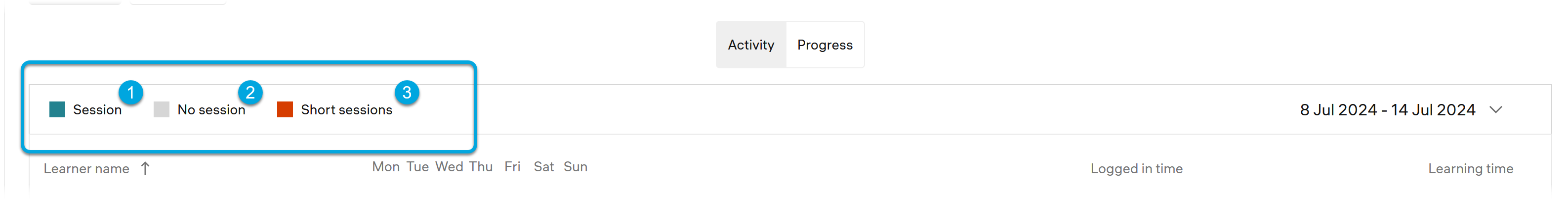 You can see on which days each learner had sessions (1 in the screenshot below), had no sessions (2), or had problematic sessions where they experienced difficulties (3).