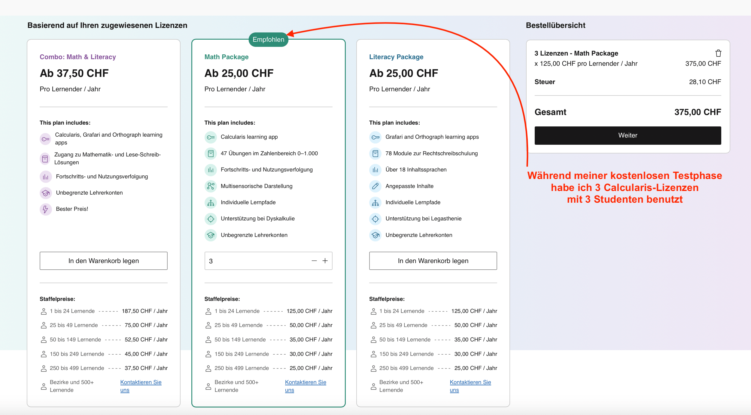 Wenn ich, wie im folgenden Beispiel, Grafari, Calcularis und Orthograph für 2 Lernende verwendet habe, wird mir empfohlen, 2 Combo-Pläne zu kaufen.