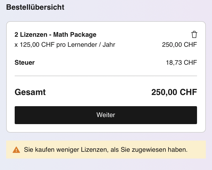 Wenn ich eine geringere Anzahl von Lizenzen kaufe, als ich meinen Lernenden zugewiesen habe, sehe ich eine Benachrichtigung in der Bestellübersicht.