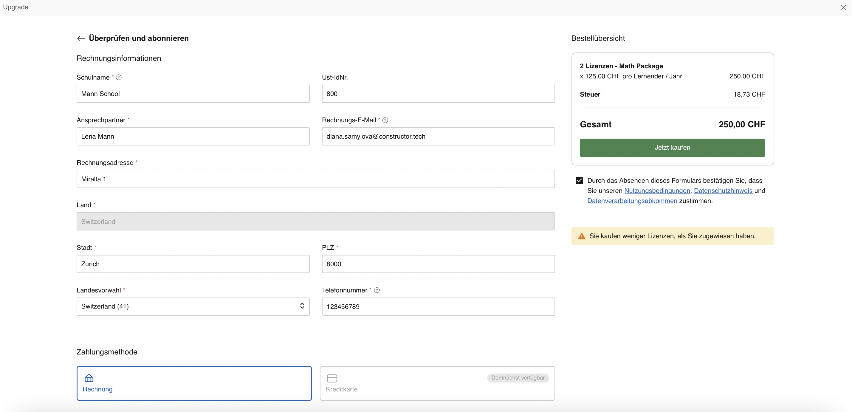 Der letzte Schritt vor dem Kauf von Lizenzen ist das Ausfüllen der Rechnungsinformationen. Diese Informationen werden benötigt, um die Rechnung auszustellen und an die E-Mail-Adresse der Schule zu senden.