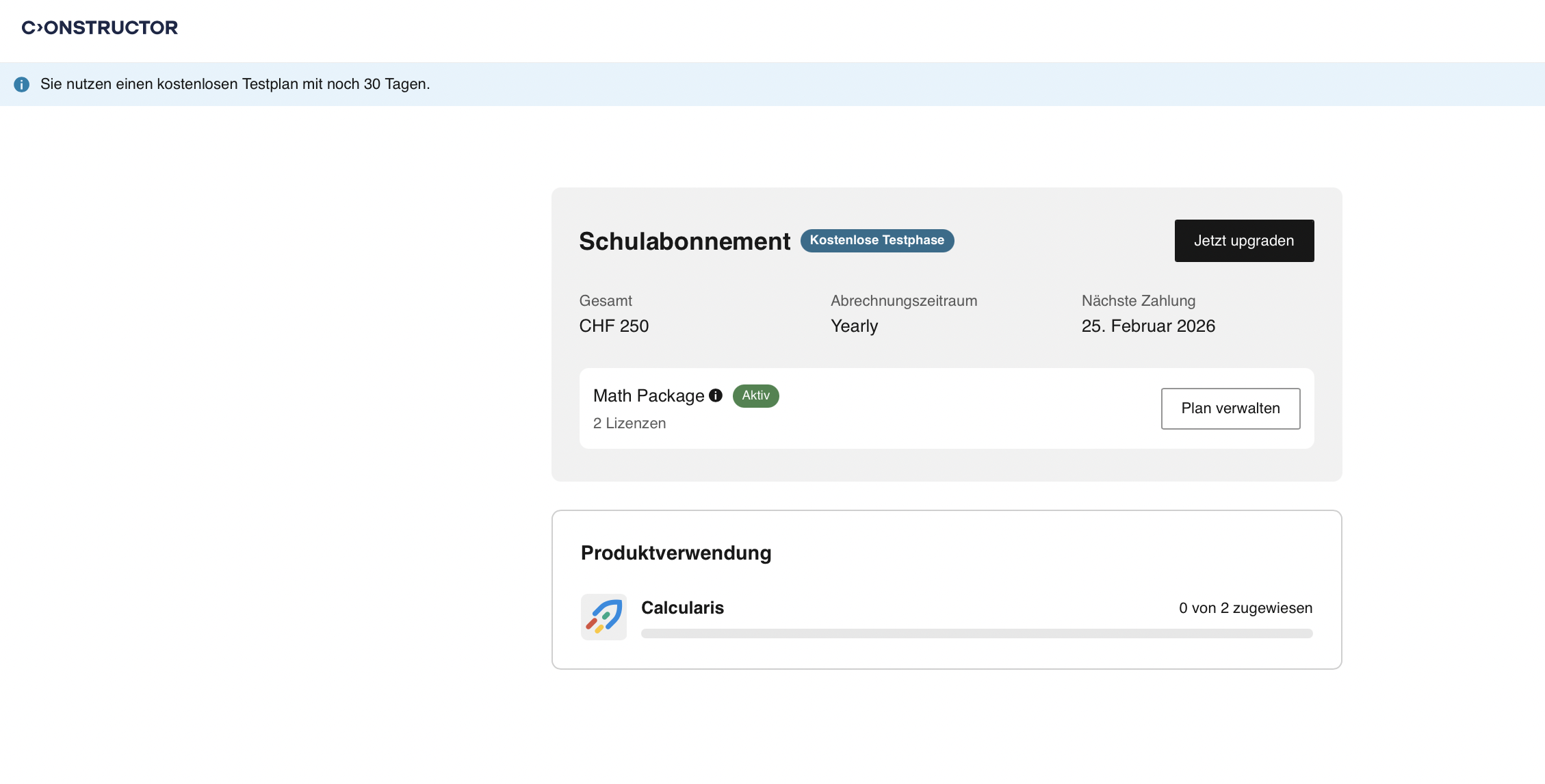 Auf dem Screenshot unten sehen wir, dass die Schule eine Lizenz von Calcularis gekauft hat, aber sie sehen immer noch das Banner für die kostenlose Testphase in Coach. Das liegt daran, dass sie die Grafari- und Orthograph-Pläne noch testen können. Sobald die Schule ein Combo- oder Alphabetisierungspaket kauft, ist die kostenlose Testphase vorbei.