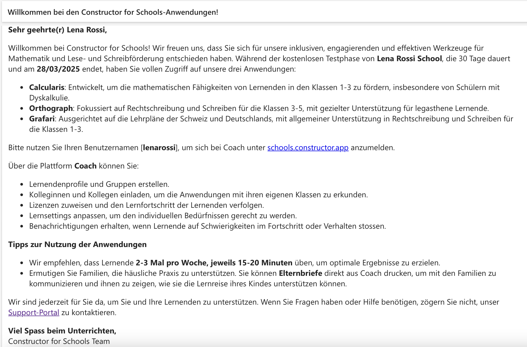 Nachdem das kostenlose Probeabonnement erstellt wurde, erhält die Lehrkraft eine Begrüßungs-E-Mail mit Informationen über die kostenlose Testphase und einer kurzen Anleitung zur Verwendung von C>T for Schools-Anwendungen.