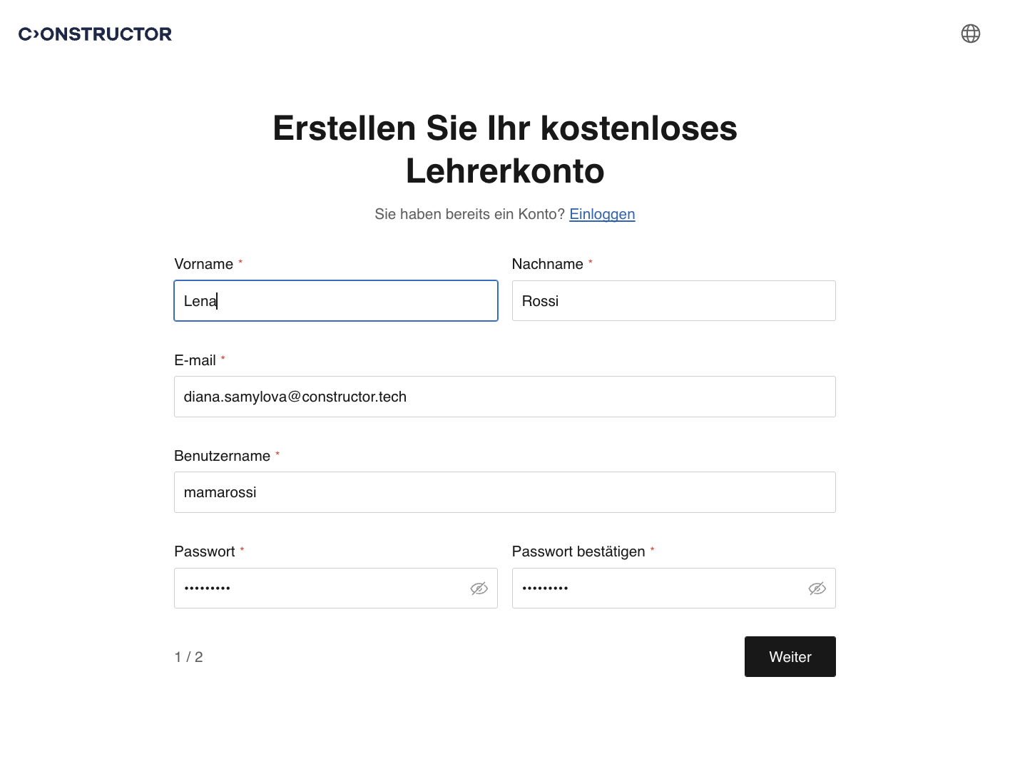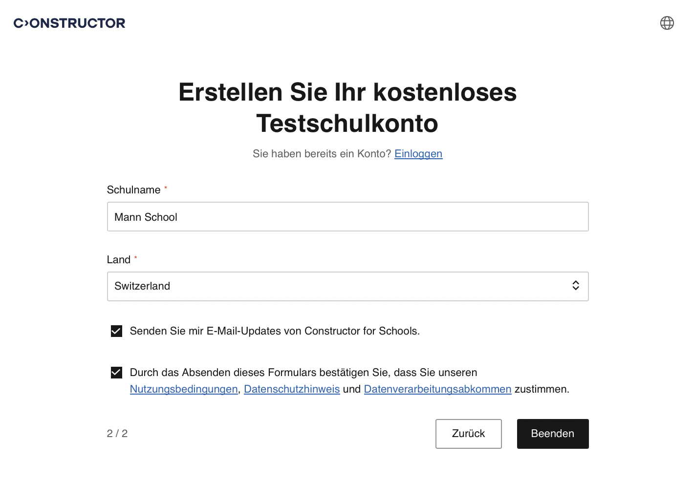 Um ein kostenloses Testkonto zu erstellen, muss sich eine Lehrkraft auf einer unserer Landing Pages oder der Website für ein kostenloses Testkonto anmelden. Der Anmeldevorgang besteht aus 2 Schritten: