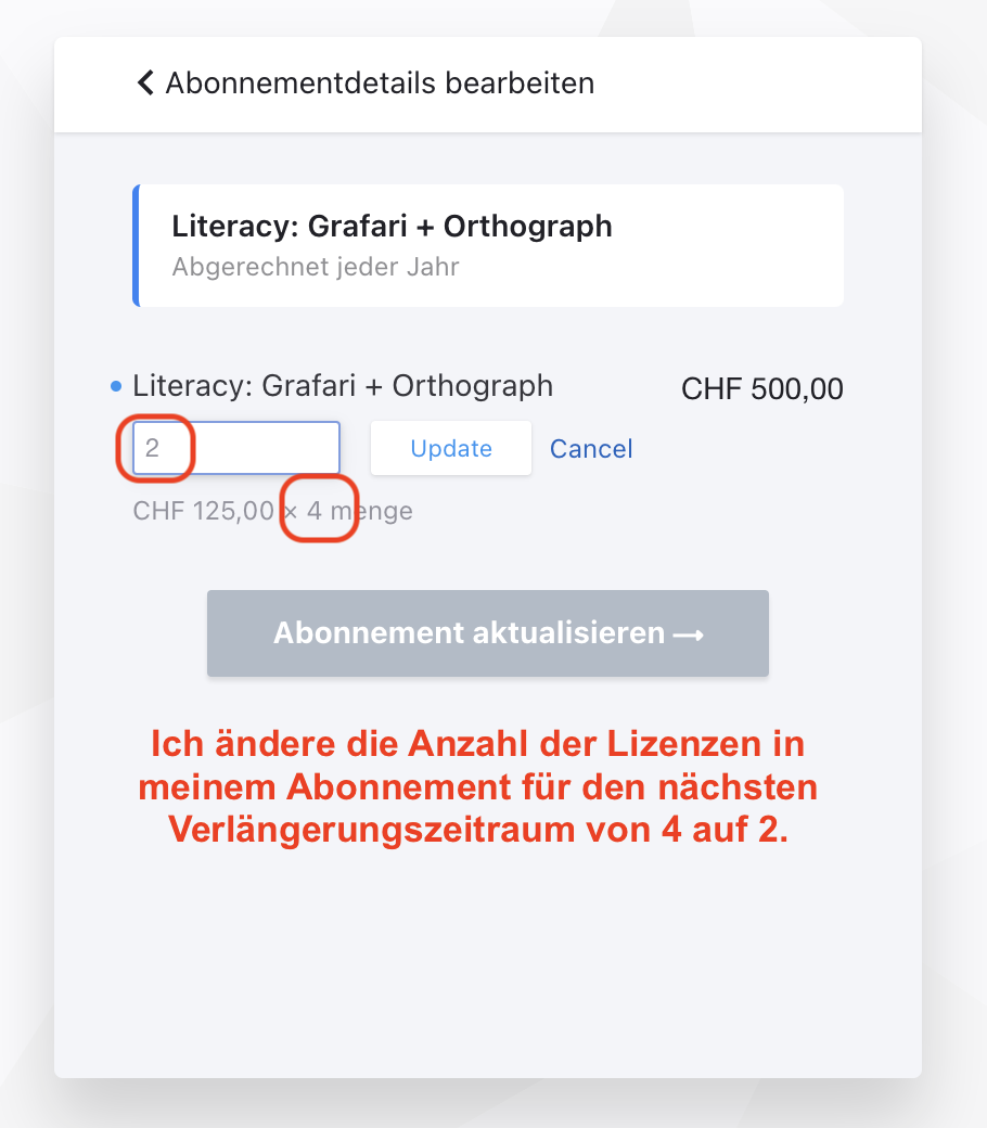 Wenn Sie die Anzahl der Lizenzen in Ihrem aktuellen Plan erhöhen möchten, können Sie einfach mehr Lizenzen für das Abonnement erwerben, das Sie mit Ihren Lernenden verwenden. Die neu erworbene Lizenz wird sofort zu Ihrem aktiven Math, Literacy- oder Kombo hinzugefügt.