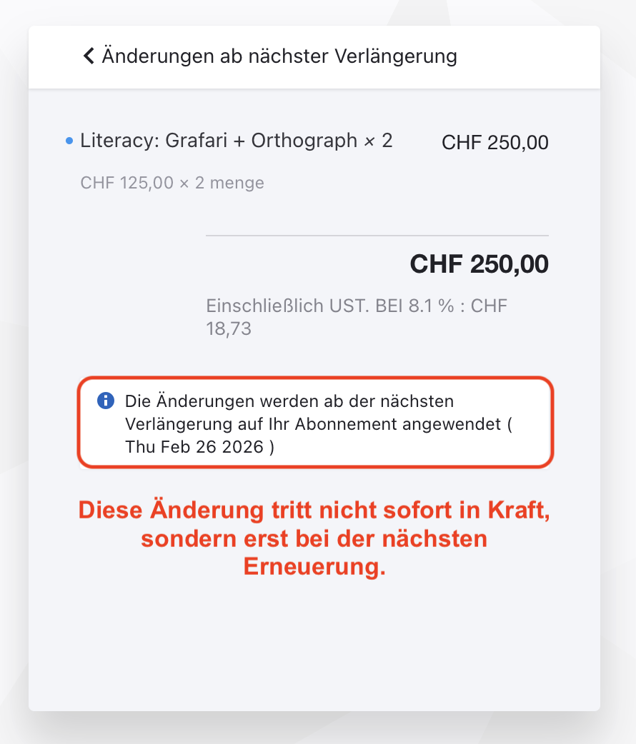 Bitte beachten Sie, dass alle Änderungen erst ab Ihrem nächsten Verlängerungsdatum wirksam werden.