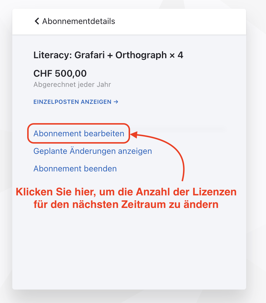 - Wählen Sie in dem sich öffnenden Fenster die Schaltfläche Abonnement bearbeiten und passen Sie die Anzahl der Lizenzen nach Bedarf an.