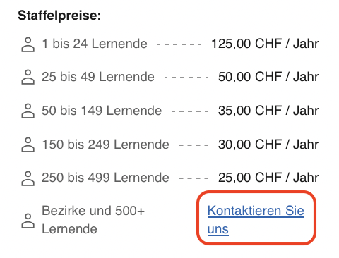 Bei Geschäften mit 500 oder mehr Lizenzen pro Schule oder bei bezirksweiten Käufen wickelt unser Vertriebsteam den Vorgang direkt ab. Wenn eine Schule oder ein Schulbezirk auf die Schaltfläche „Kontakt“ auf der Paywall (Seite mit allen Abonnements) klickt, wird sie/er zu einem Formular auf unserer Website weitergeleitet.