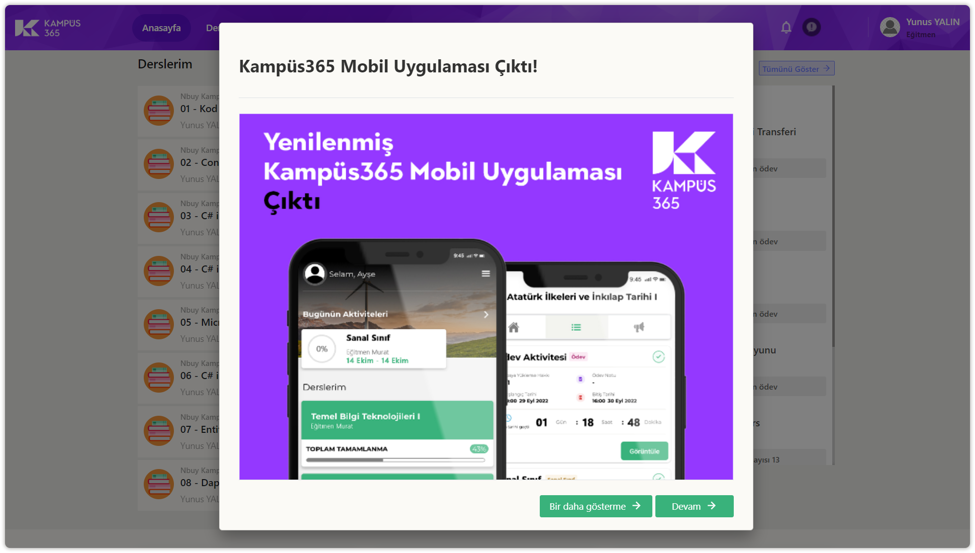 - Derslerim, bölümünde dersleriniz listelenir. Derslerin sağında sırasıyla yaklaşan aktivite, yeni duyuru ve tüm öğrenciler için tamamlama yüzdesi bildirimleri yer alır. Ders adlarına tıklayarak derse gidebilir, bildirim düğmelerine tıklayarak bildirimle ilişkili sayfaya gidebilir ve tümünü gör düğmesine tıklayarak tüm derslerinizi görüntüleyebilirsiniz. (Detaylar İçin Derslerim Sayfasına Gidin.)