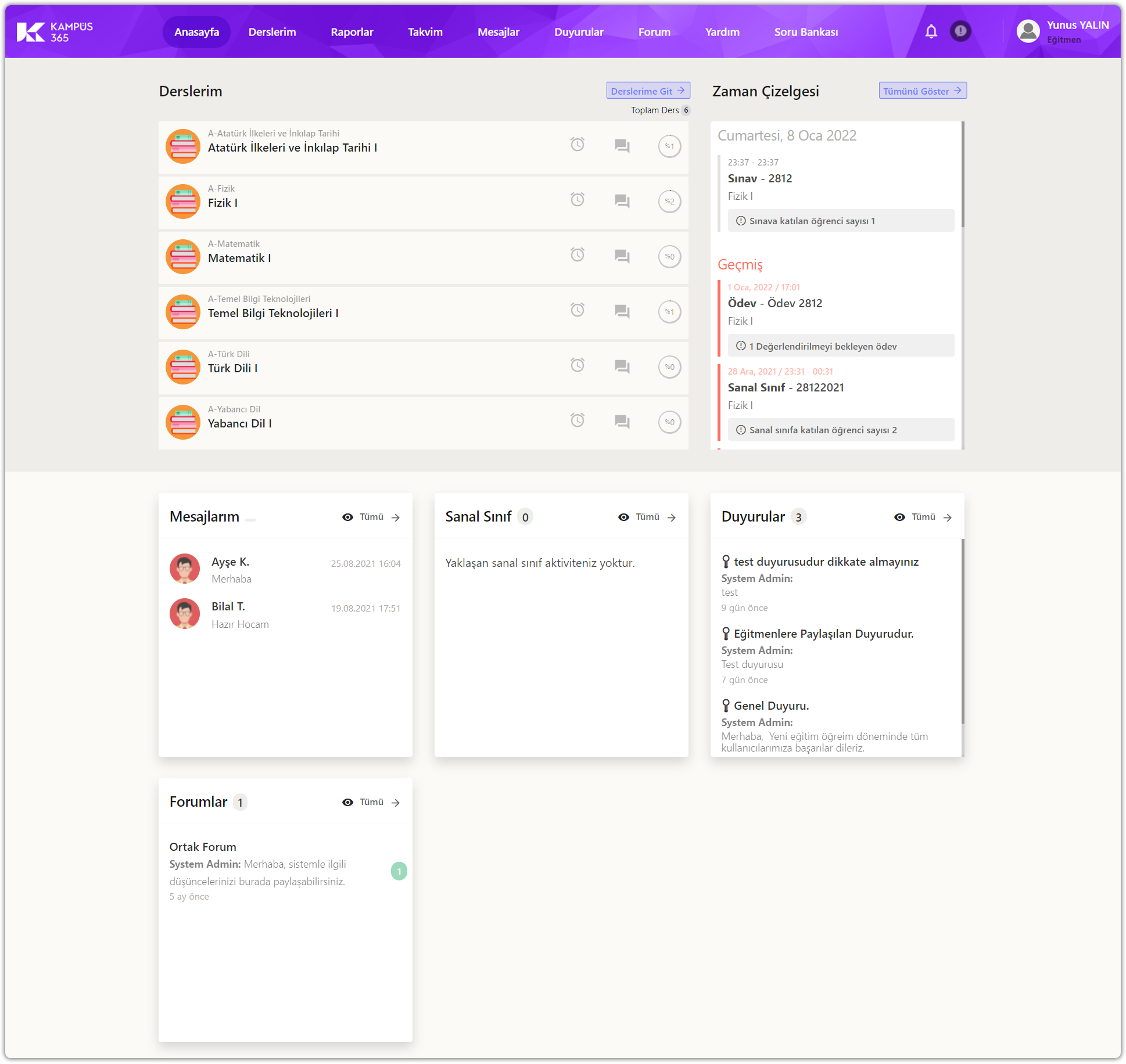 Ana sayfada sırasıyla derslerim, zaman çizelgesi, mesajlarım, sanal sınıf, duyurular ve formlar bölümleri yer alır.