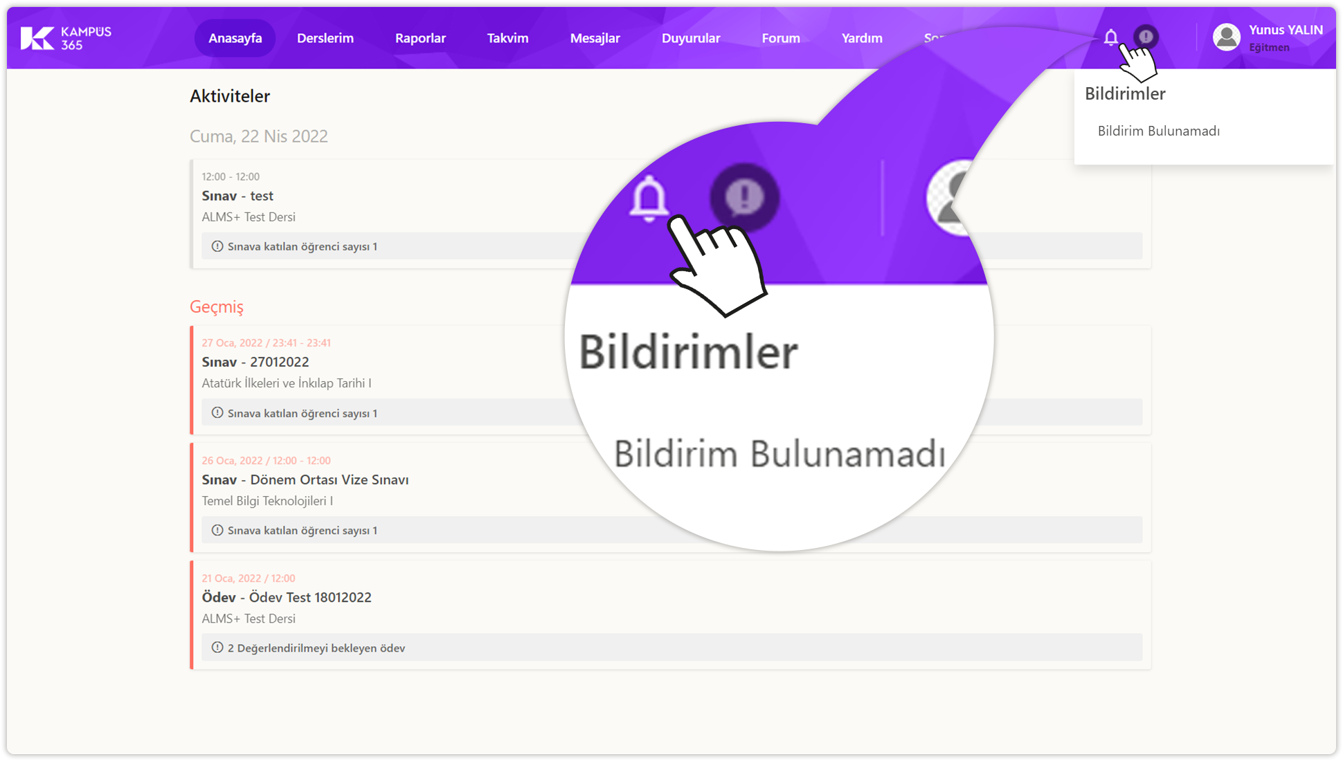 Ana sayfada ve tüm sayfalarda sağ üste yer alan zil düğmesine tıklayarak gerçekleşen olaya göre ders, mesaj, duyuru, takvim ve forum yeni bildirimlerini görüntüleyebilirsiniz.