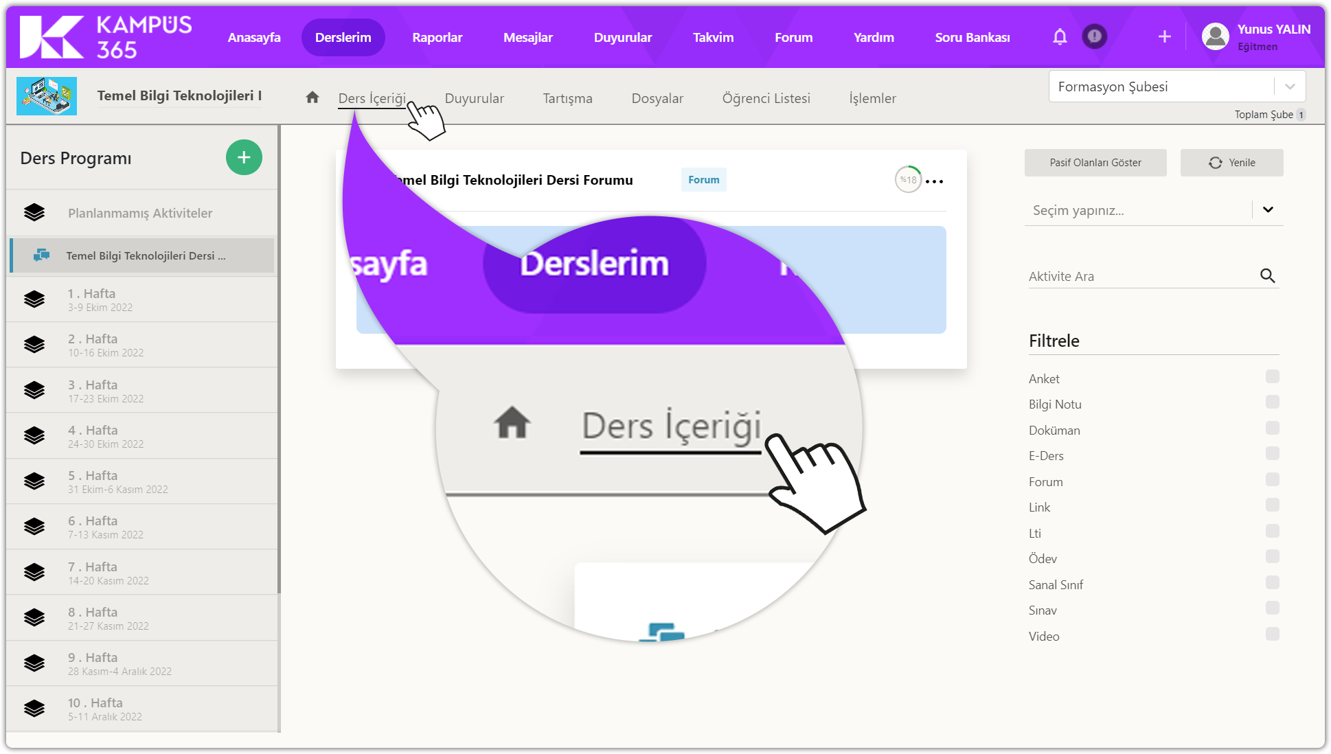 | Ders içeriği sayfasında sol üstte ders programı yazsının sağında yer alan artı (+) düğmesine tıklayın. | Aktivite tipinde forum aktivitesi düğmesine tıklayın. |