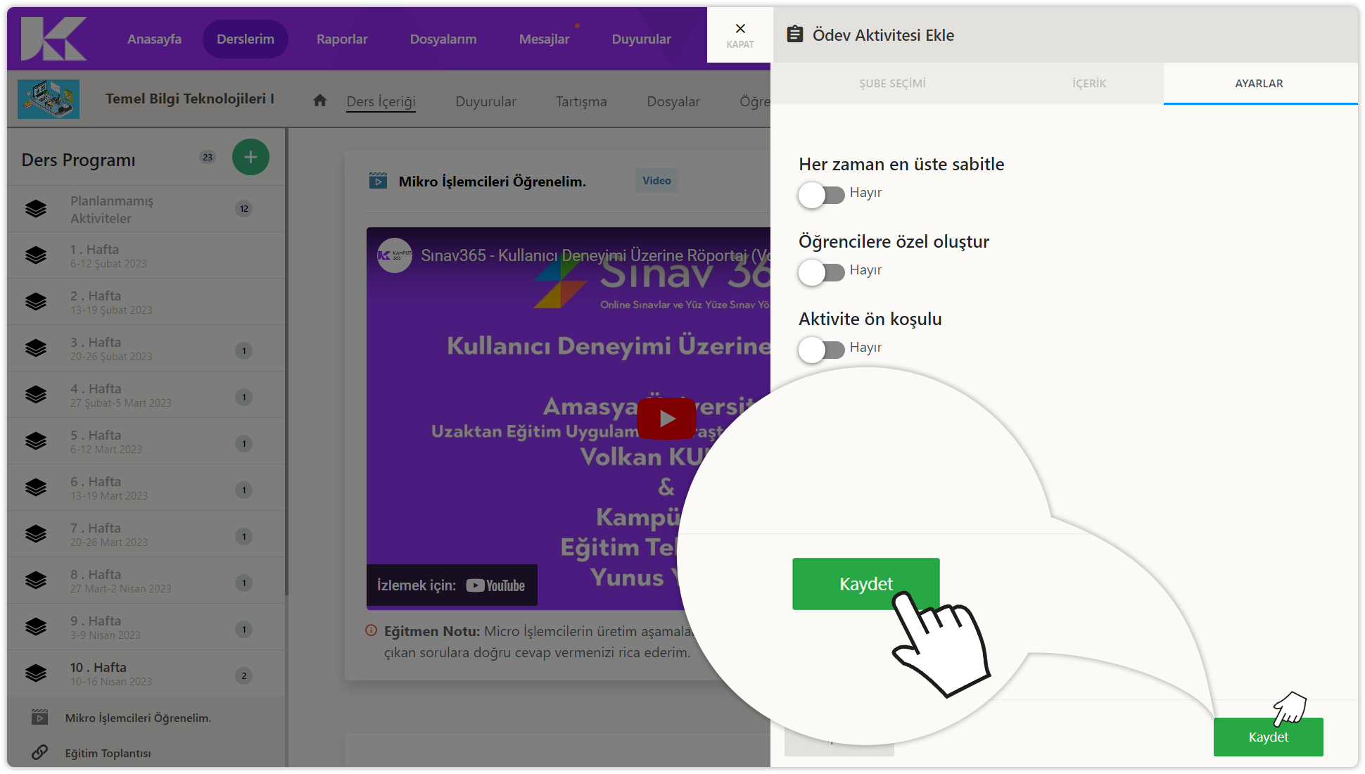 Kaydet düğmesine tıklayarak aktiviteyi yayınlayın. Aktivite belirlediğiniz ayarlara göre öğrencilere gösterilecek ve öğrencilerden geri dönüşler almaya başlayacaksınız. Ödev aktivitesini belirlediğiniz hafta veya tarih aralığında görüntüleyebilirsiniz.