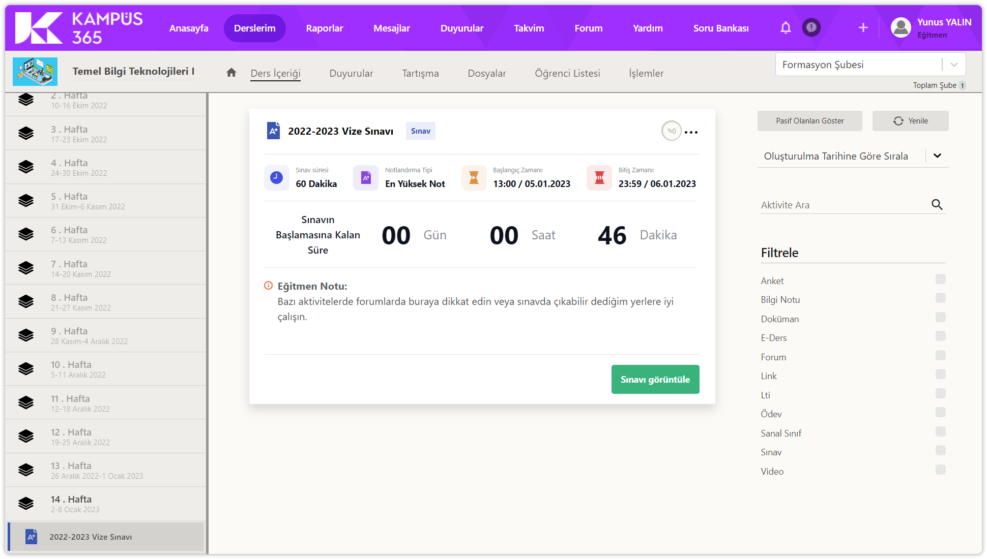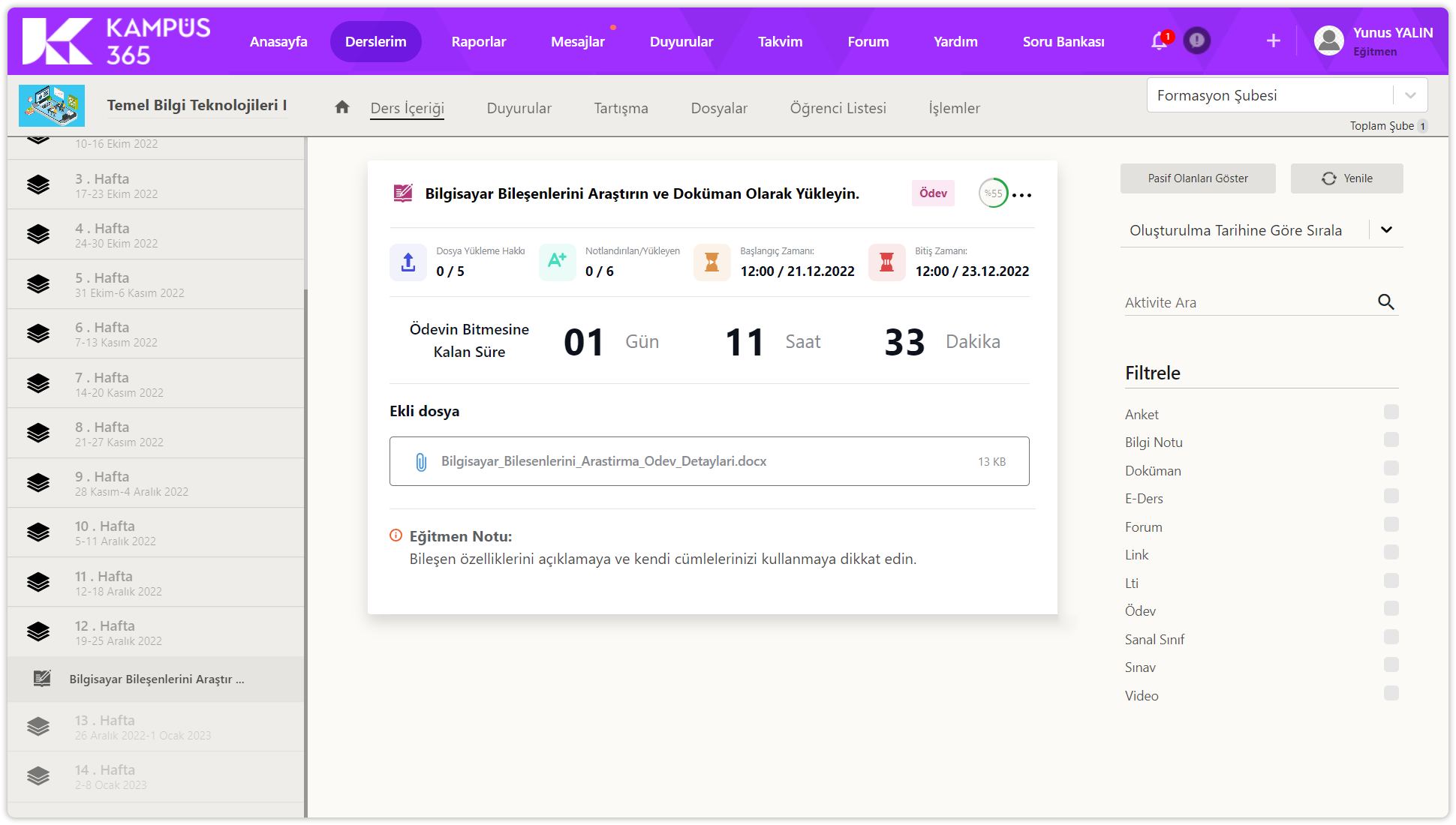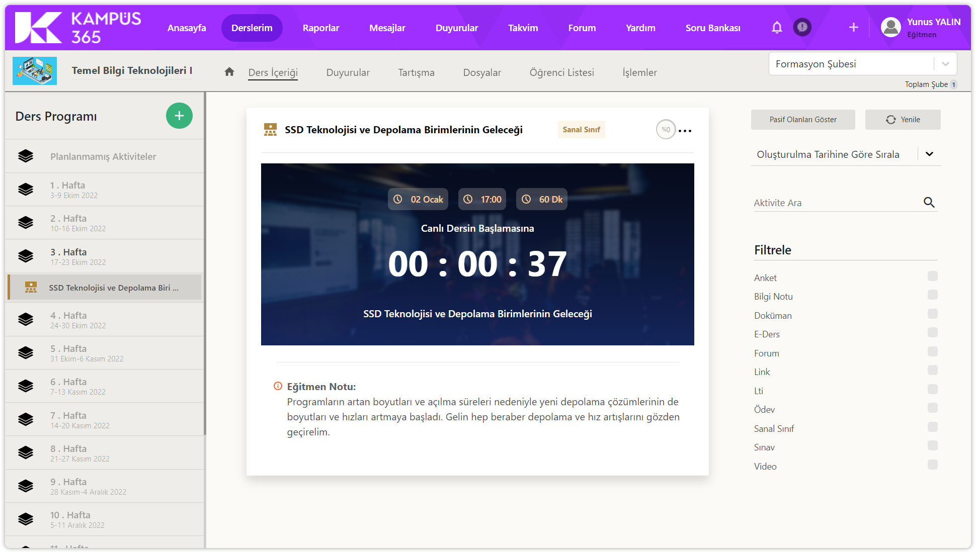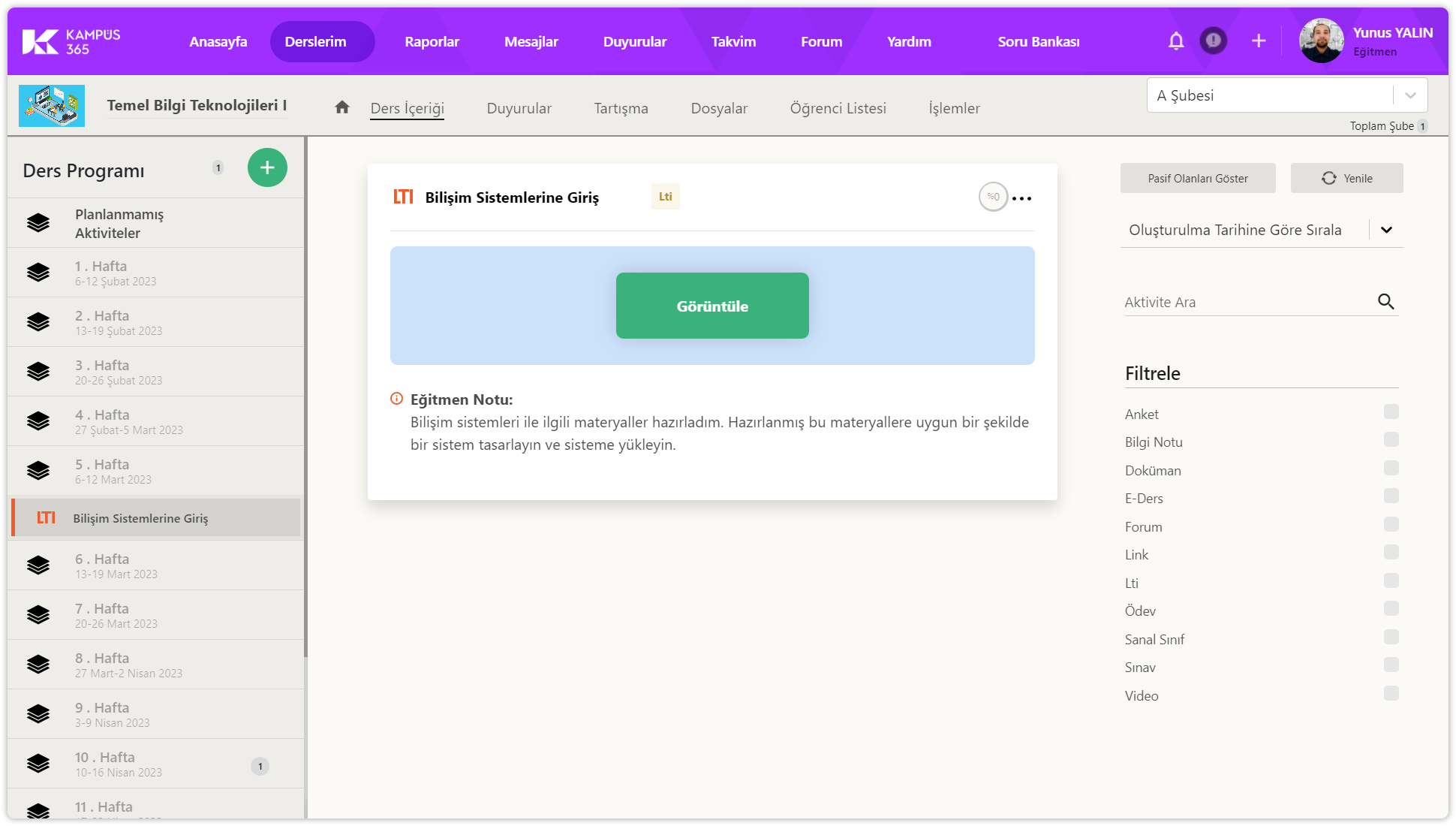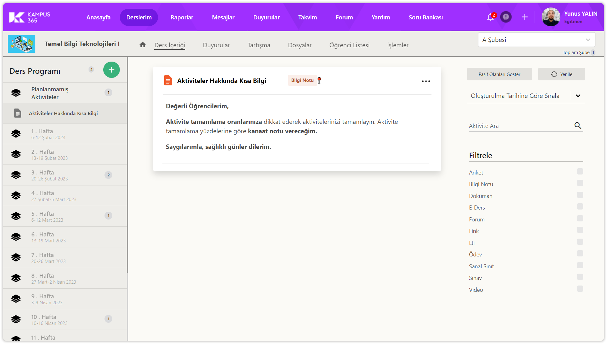 | Bilgi Notu: Ders haftalarınızın altında o hafta ile ilgili bilgileri bilgi notu olarak paylaşabilirsiniz. |