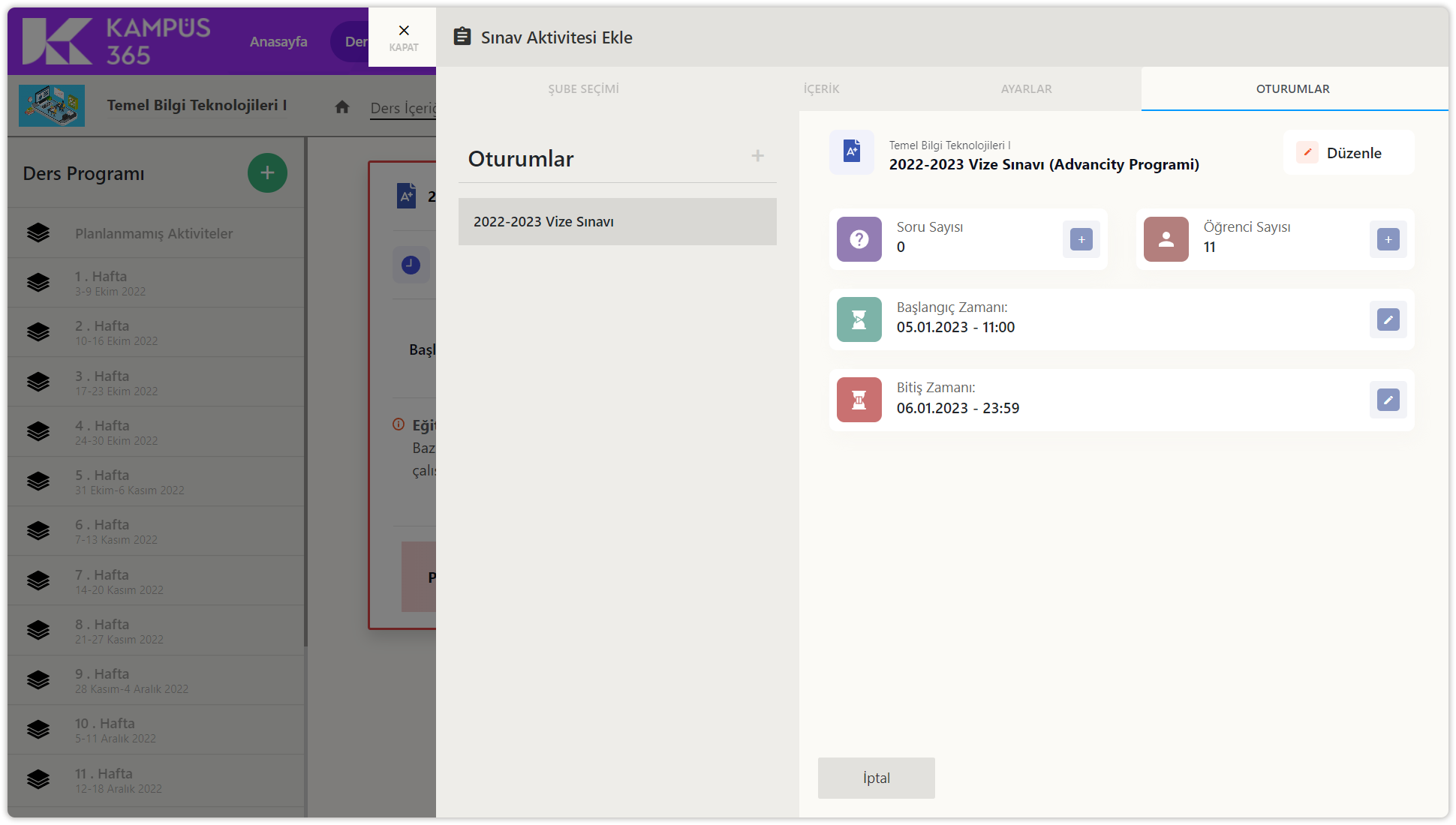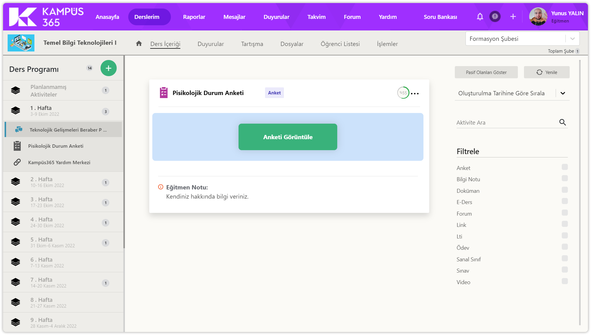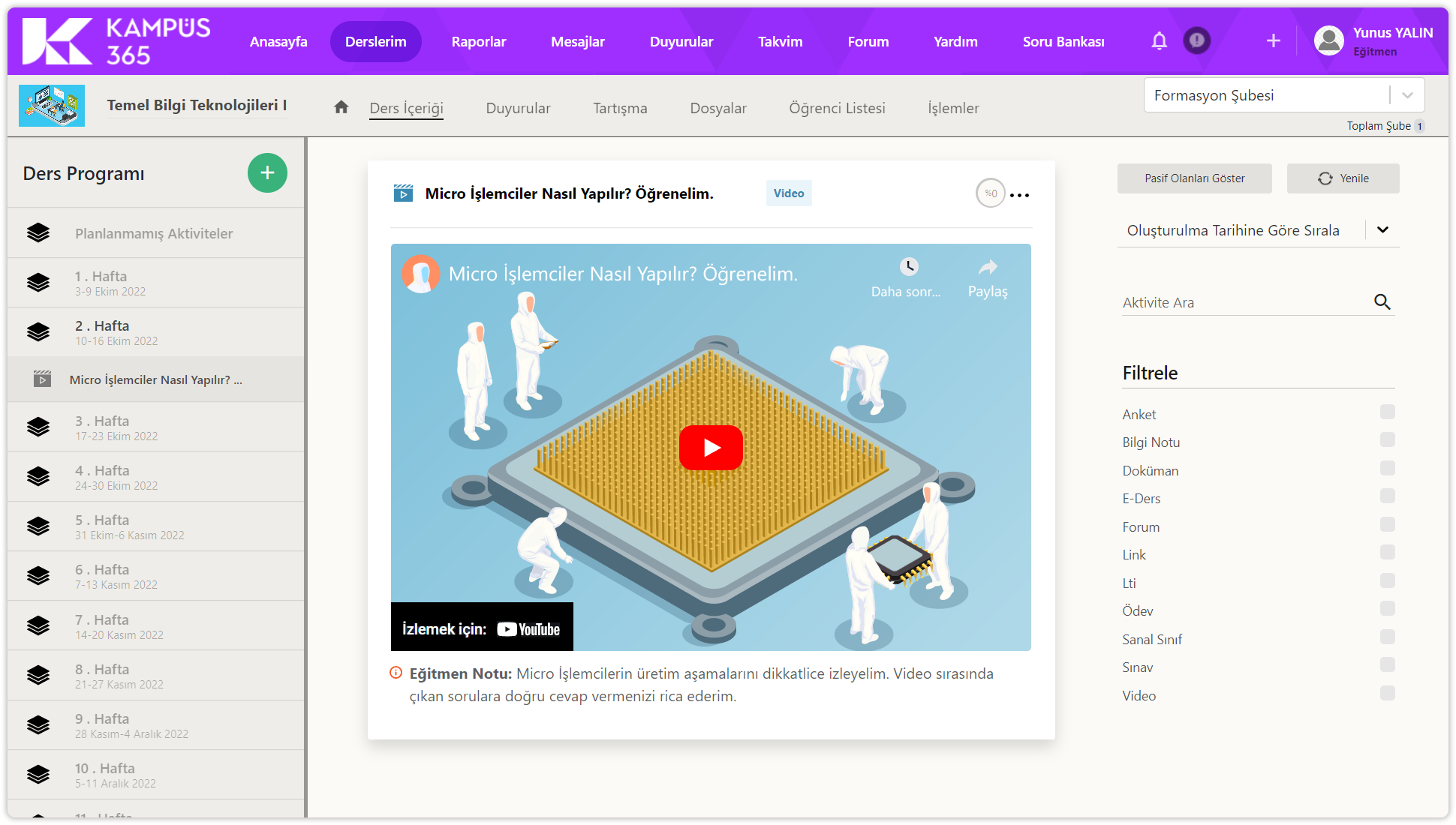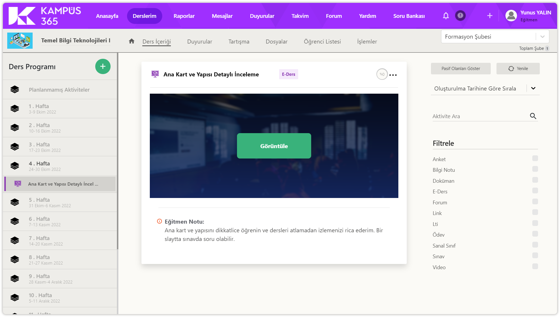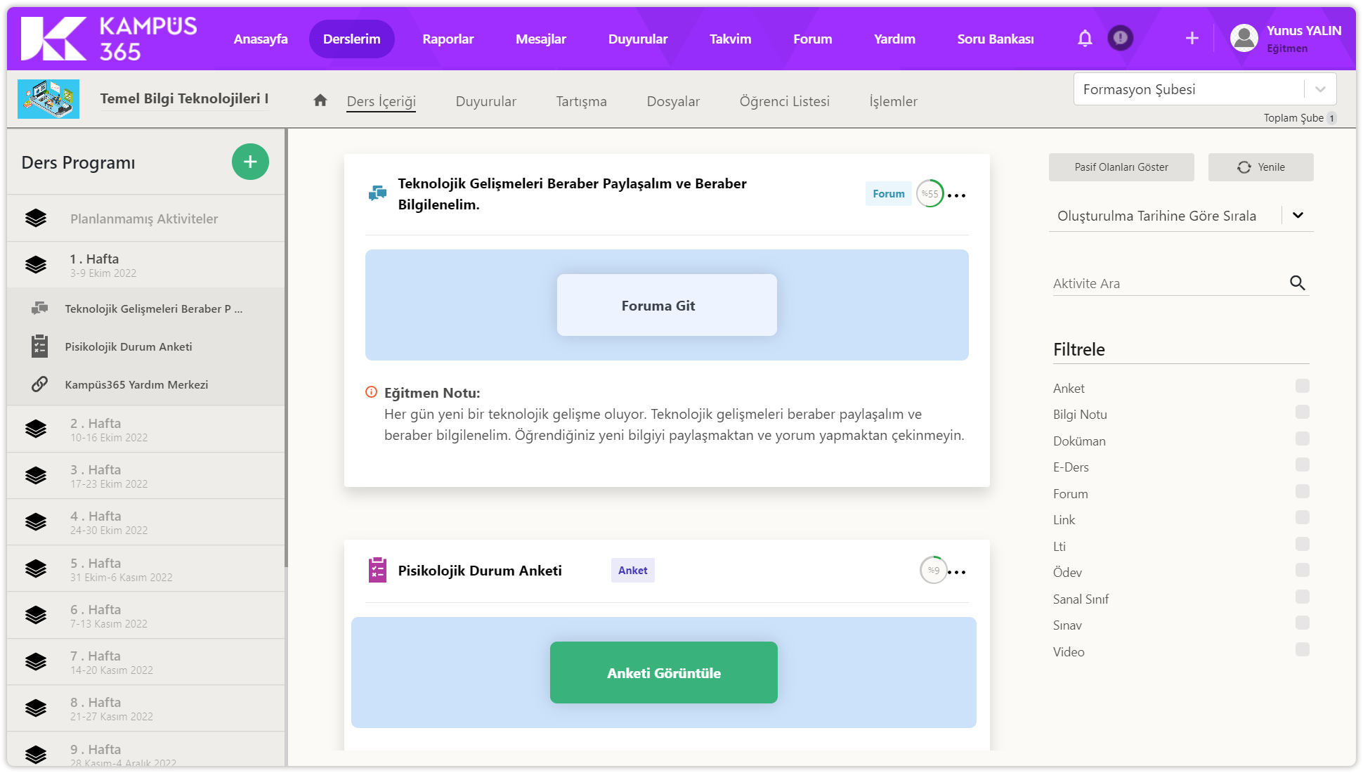 | Bilgi Notu: Ders haftalarınızın altında o hafta ile ilgili bilgileri bilgi notu olarak paylaşabilirsiniz. |