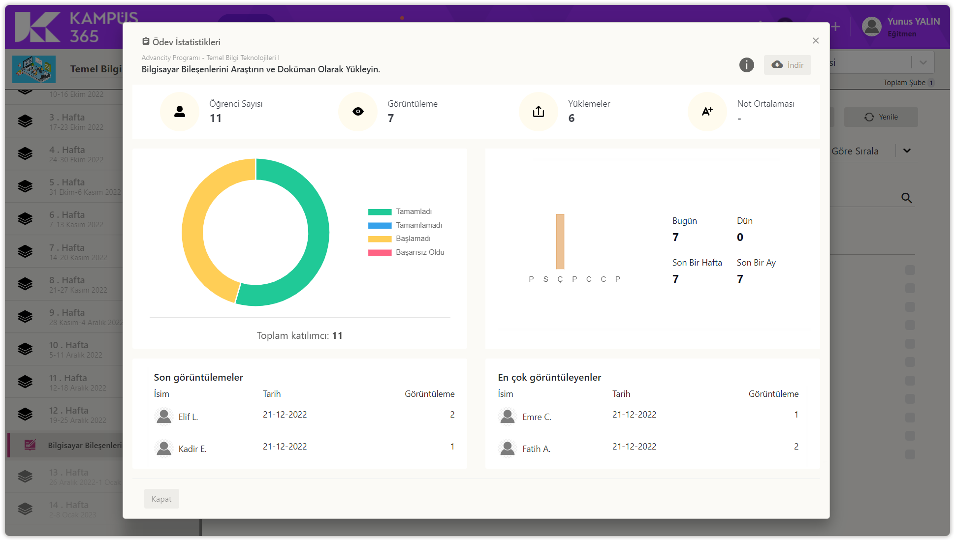 Ödev aktivitesi raporu penceresinde; aktivitenin olduğu ders ve şube; aktivitenin adı; öğrenci sayısı, görüntüleme, yükleme ve not ortalaması bilgileri; aktivite tamamlama, tamamlamama, başlamadı ve başarısız oldu grafiği; ödeve bugün, dün, son bir hafta ve son bir ay içerisinde kaç kişinin eriştiği; son görüntülemeler isim, tarih ve görüntüleme sayısı; en çok görüntüleyenler isim, tarih ve görüntüleme sayılarını öğrenebilirsiniz.