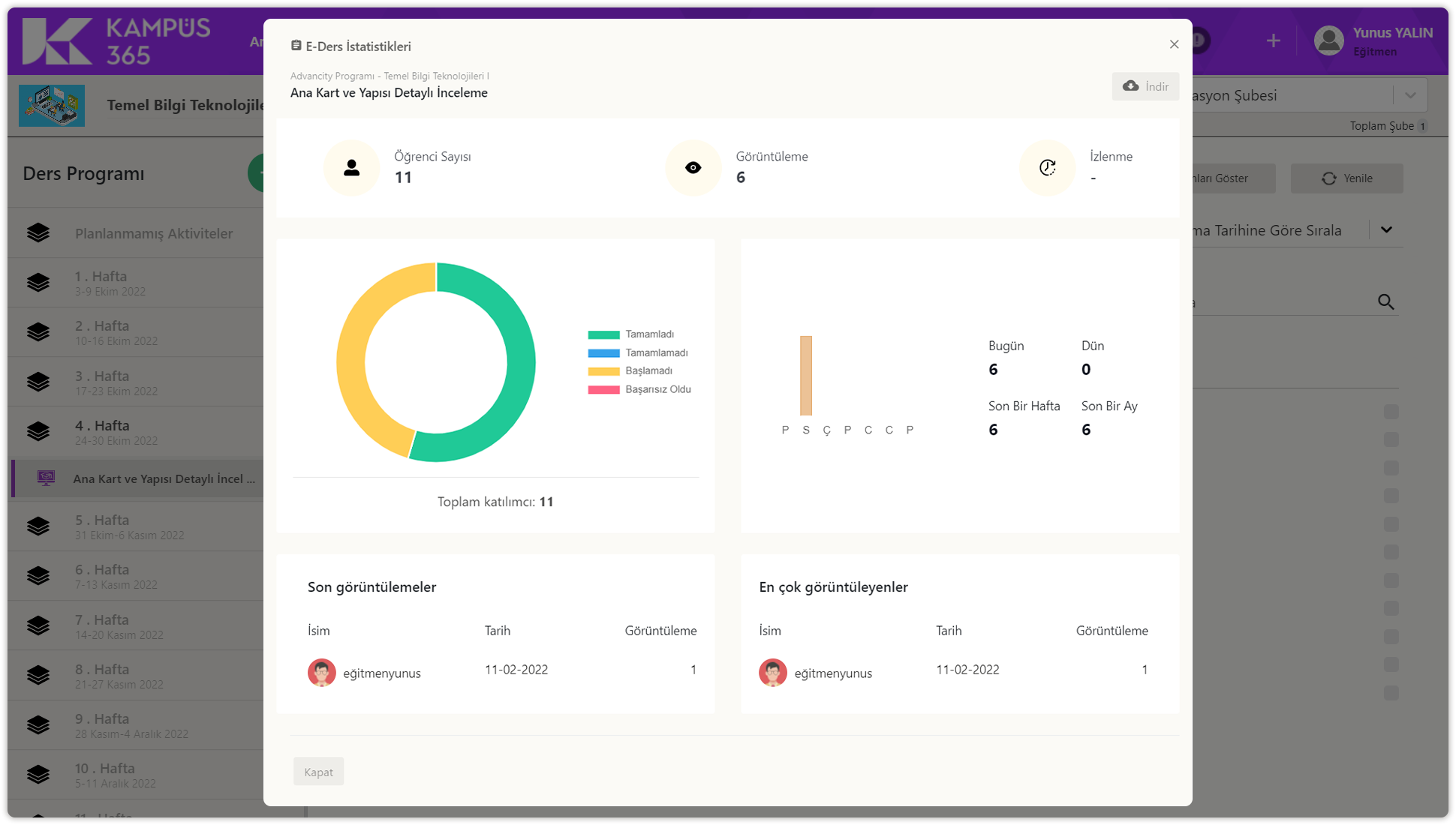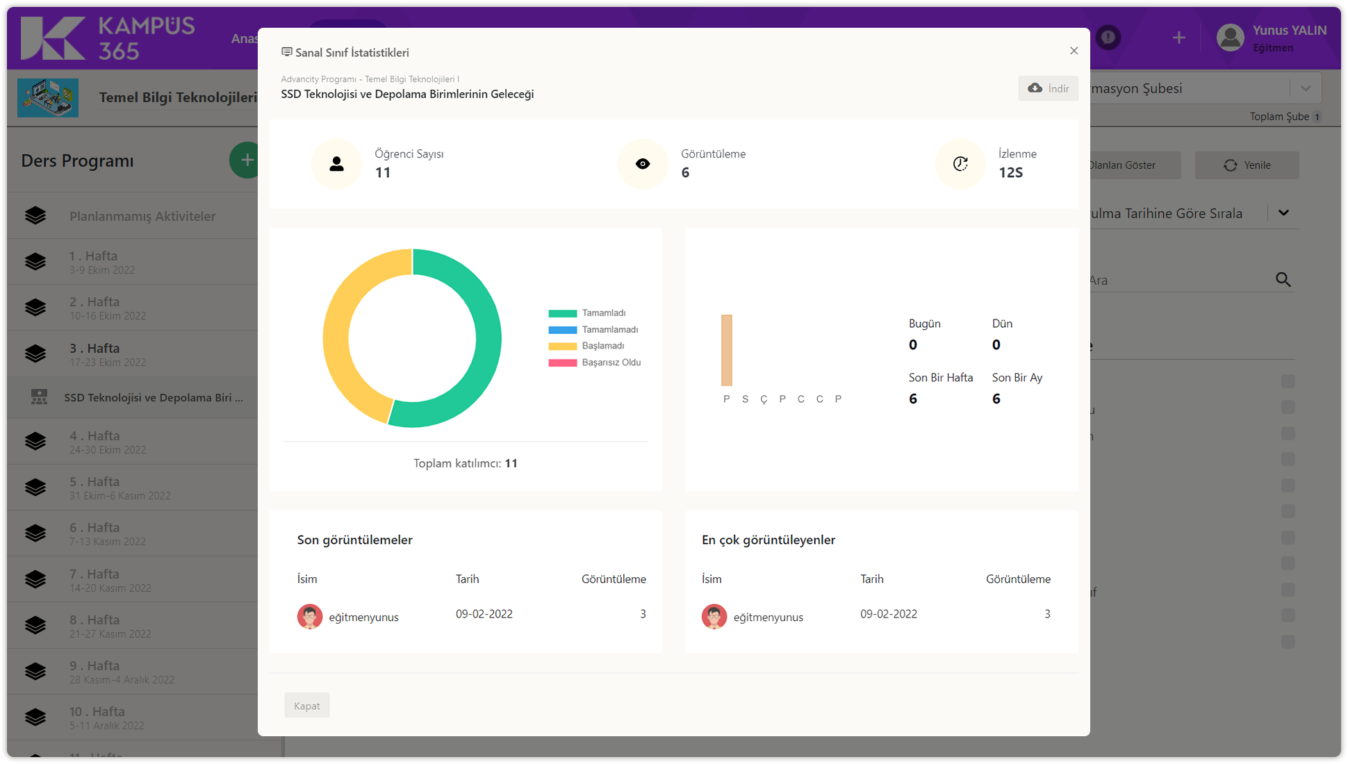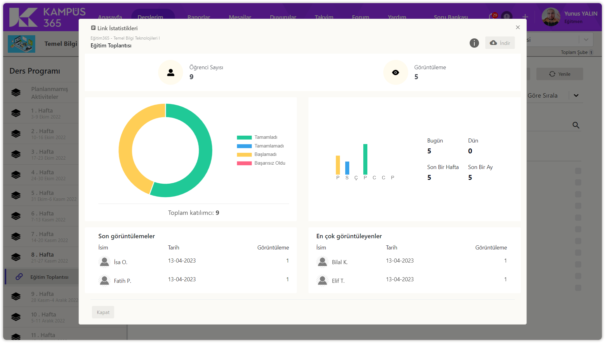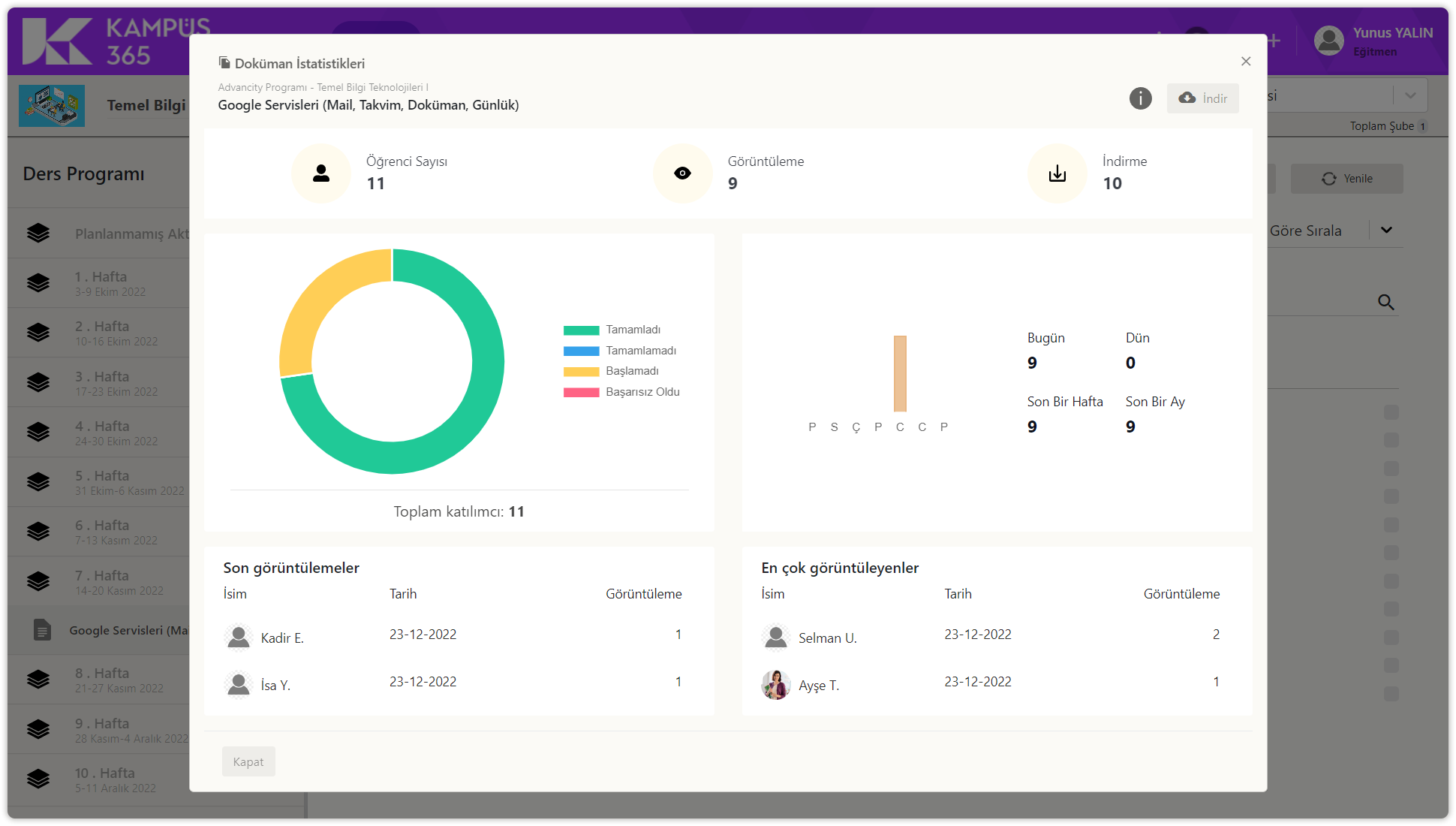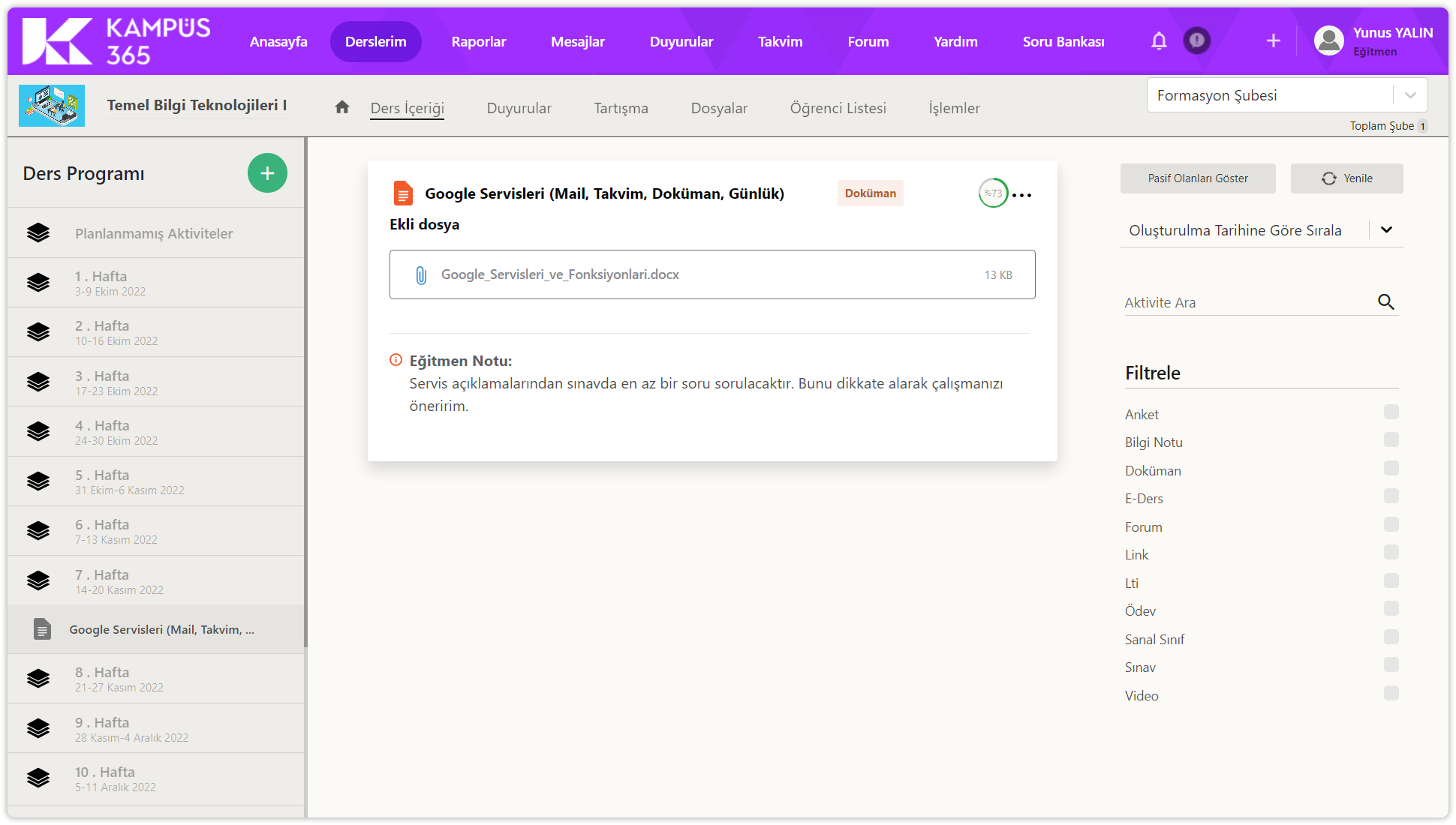 Aktivite belirlediğiniz ayarlara göre öğrencilere gösterilecektir. Doküman aktivitesini belirlediğiniz hafta veya tarih aralığında görüntüleyebilirsiniz.