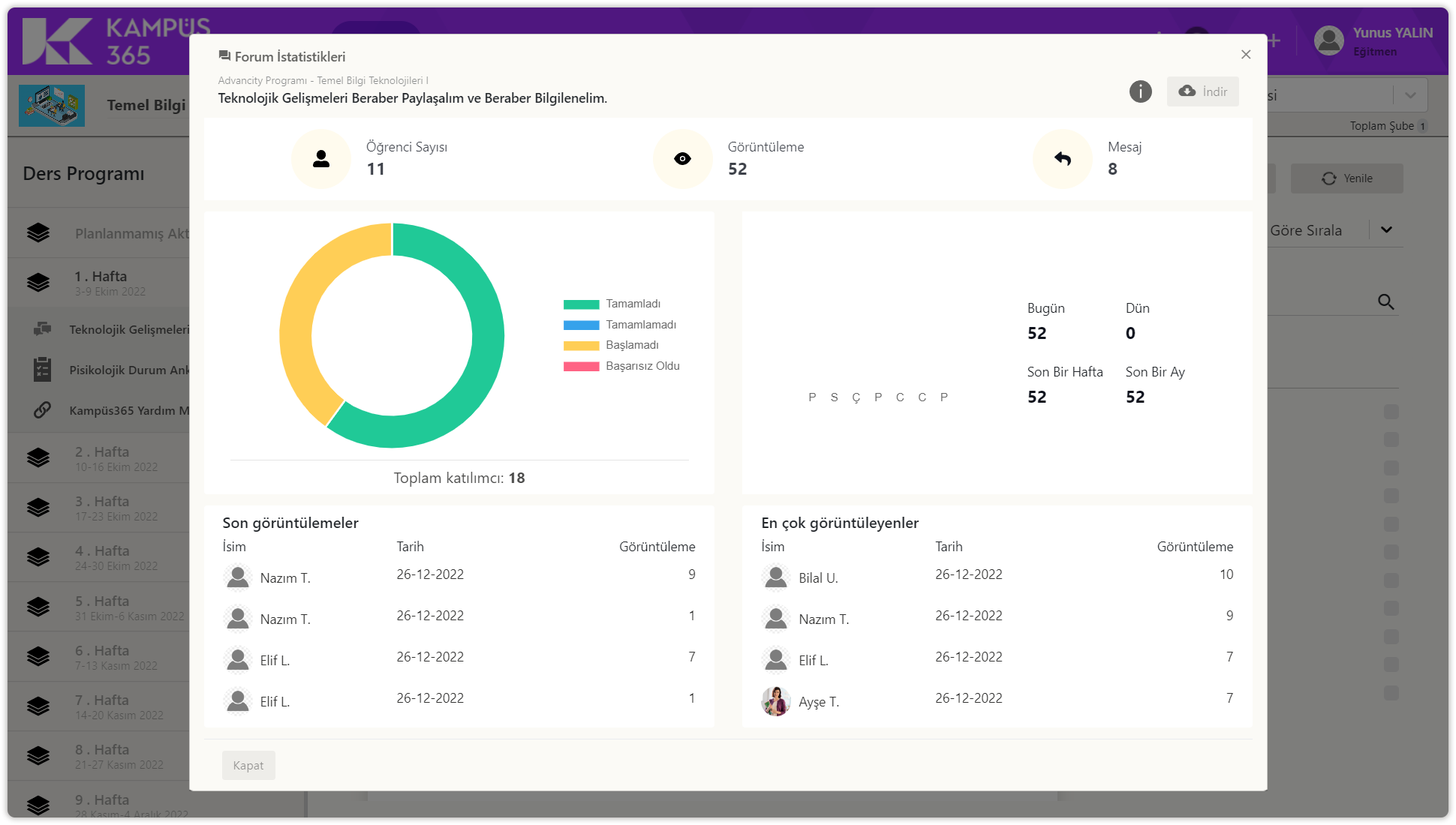| Doküman aktivitesinde doküman adına tıklayarak dokümanı indirebilirsiniz. | Tamamlama yüzdesi üzerine geldiğinizde bitirme kriteri ve tamamlayan sayısı bilgilerini görüntüleyebilirsiniz. |