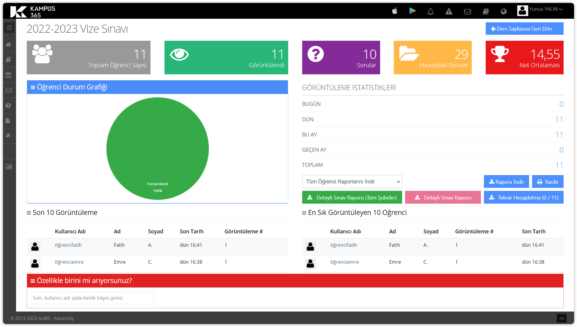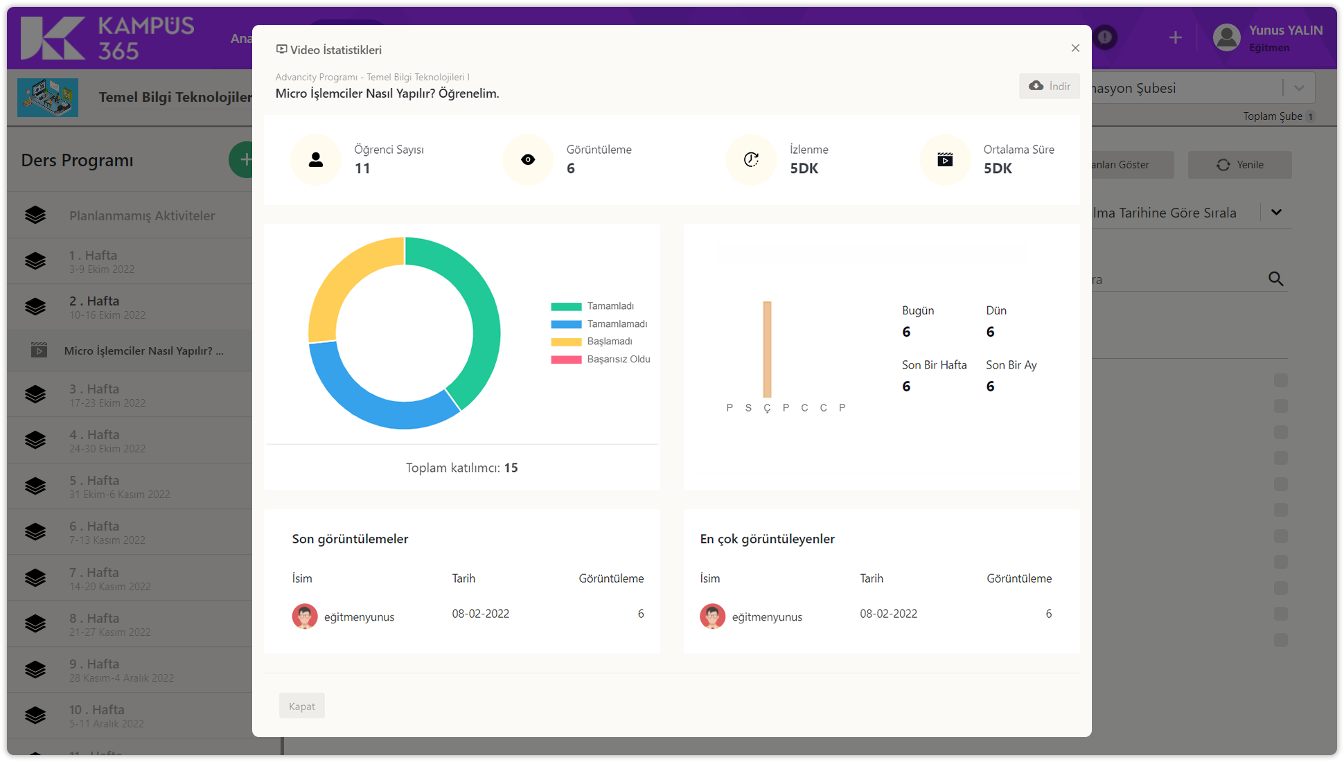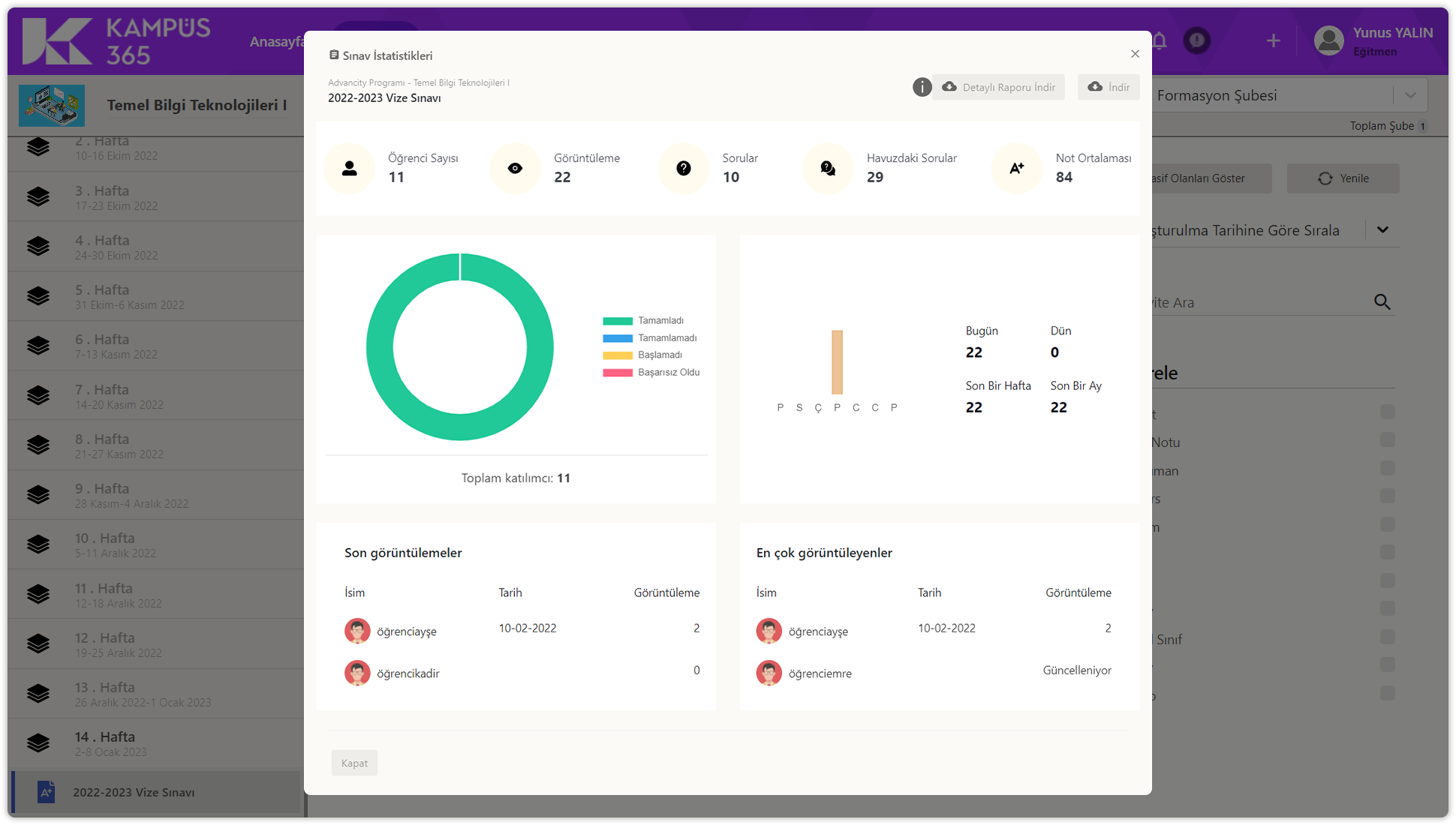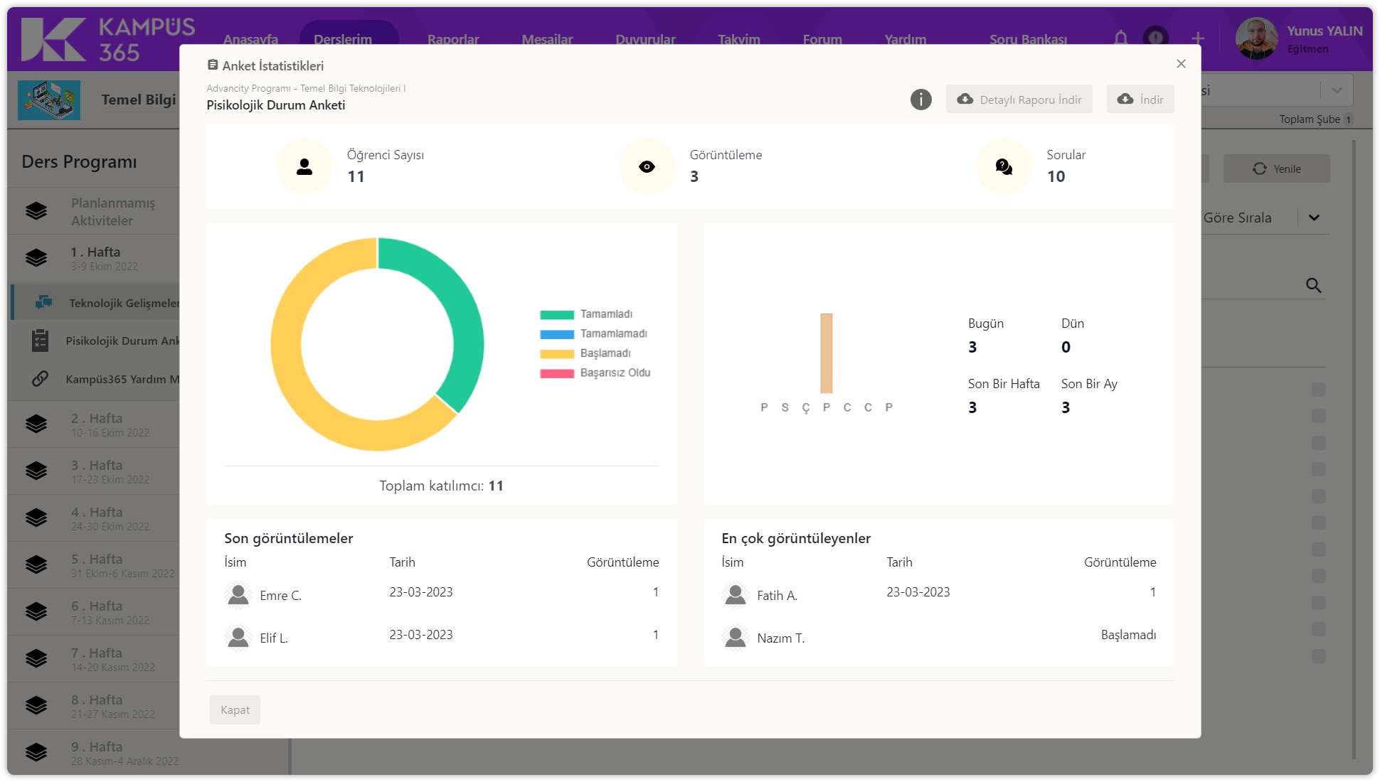 Anket aktivitesi raporu içerisinde; aktivitenin olduğu ders ve şube; aktivitenin adı; öğrenci sayısı, görüntüleme ve soru sayı bilgileri; aktivite tamamlama, tamamlamama, başlamadı ve başarısız oldu grafiği; anket bugün, dün, son bir hafta ve son bir ay içerisinde kaç kişinin eriştiği; son görüntülemeler isim, tarih ve görüntüleme sayısı; en çok görüntüleyenler isim, tarih ve görüntüleme sayılarını öğrenebilirsiniz. Rapor sayfasının sağ üstünde yer alan detaylı raporu indir ve indir düğmesine tıklayarak raporu indirebilirsiniz.