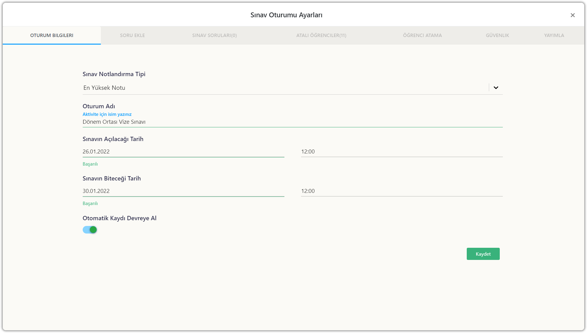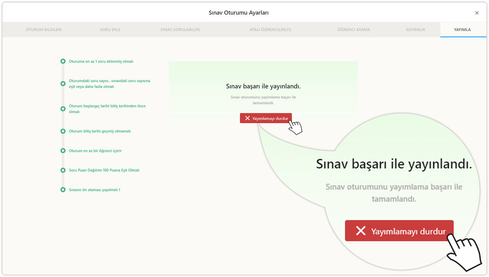 | Sanal Sınıf: Çevrimiçi (Online) ortamda öğrenciler ile senkron şekilde oturum gerçekleştirebilirsiniz. Gerçekleştirilen oturumların tekrar izlemelerine ulaşabilirsiniz. | Sınav: Soru bankası üzerinden oluşturulan çeşitli soru tiplerini kullanarak öğrencilerin belirli tarih aralıklarında katılabileceği ve raporlanarak değerlendirilebileceği çevrimiçi (online) sınavlarınızı oluşturabilirsiniz. |