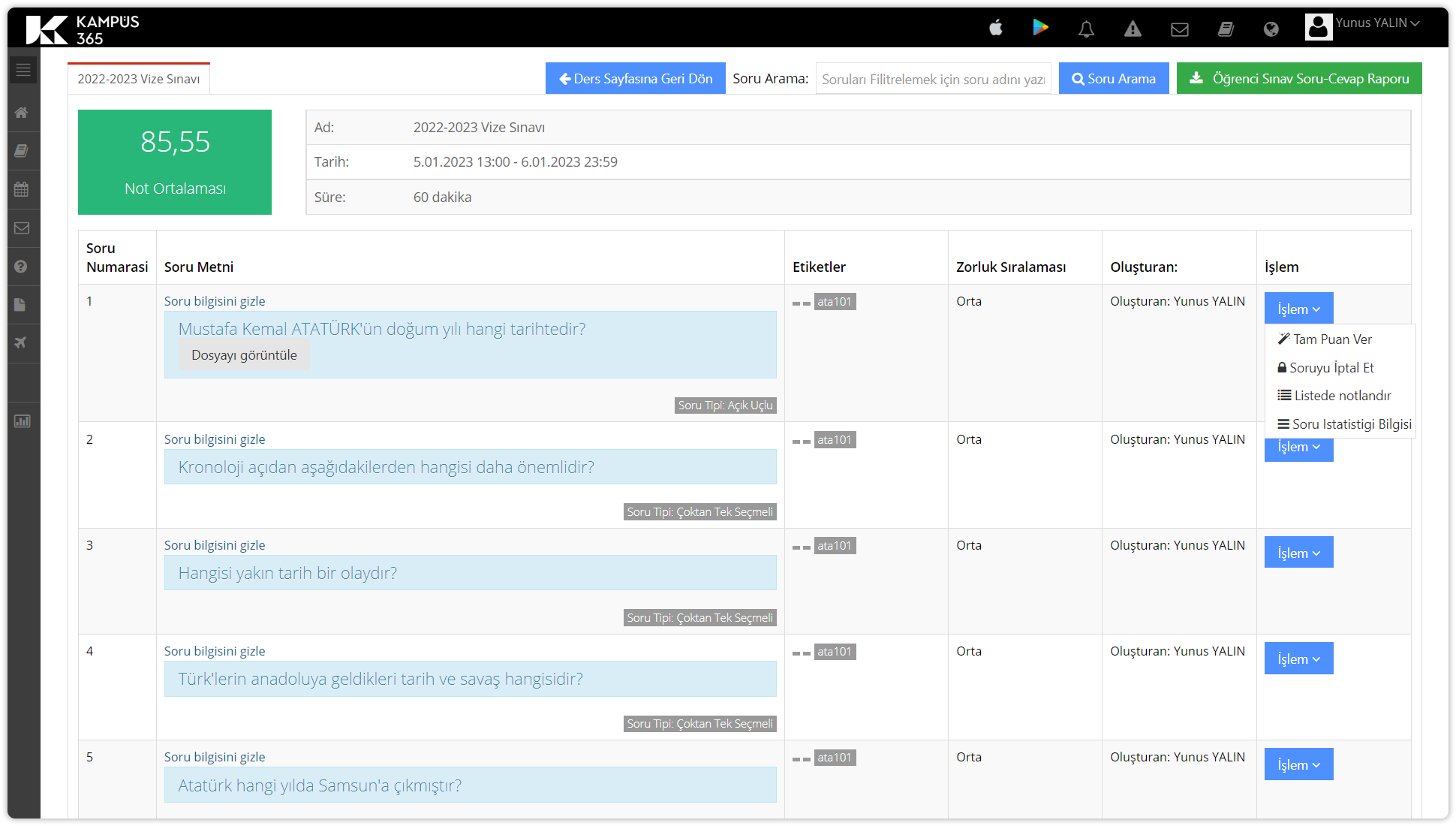 | Ödev kontrolünün ardından ödev notlandırma penceresinde kişi satırlarının en sağında yer alan not verme alanından ilgili kişi için numaraları kullanarak not bilgisi girin. |