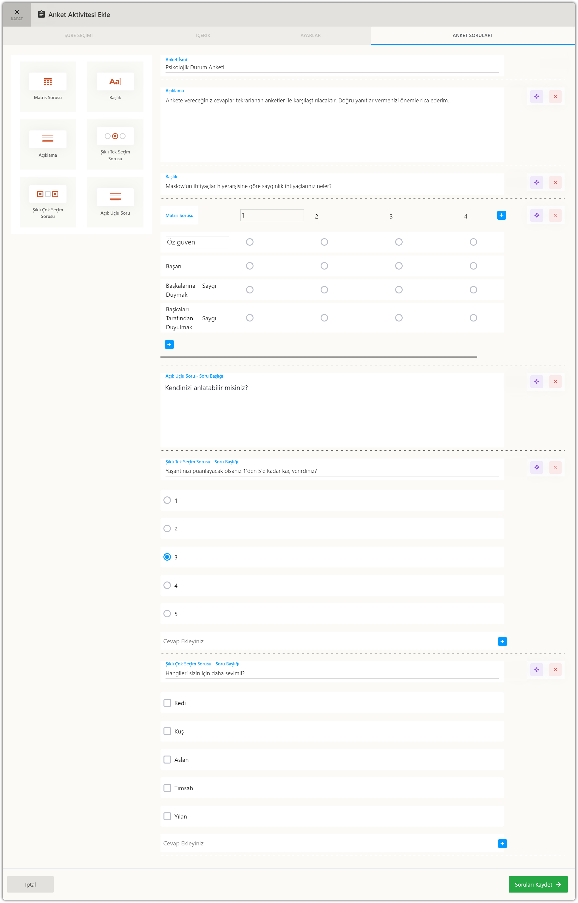 | E-Ders: Scorm yapısı ile hazırlanmış akıllı içeriklerinizi paylaşabilirsiniz. | Anket: Çeşitli yöntemlerle oluşturduğunuz soruları veya bilgileri öğrenciler ile paylaşarak bilgi toplayabilir ve sonuçlar çıkarabilirsiniz. |