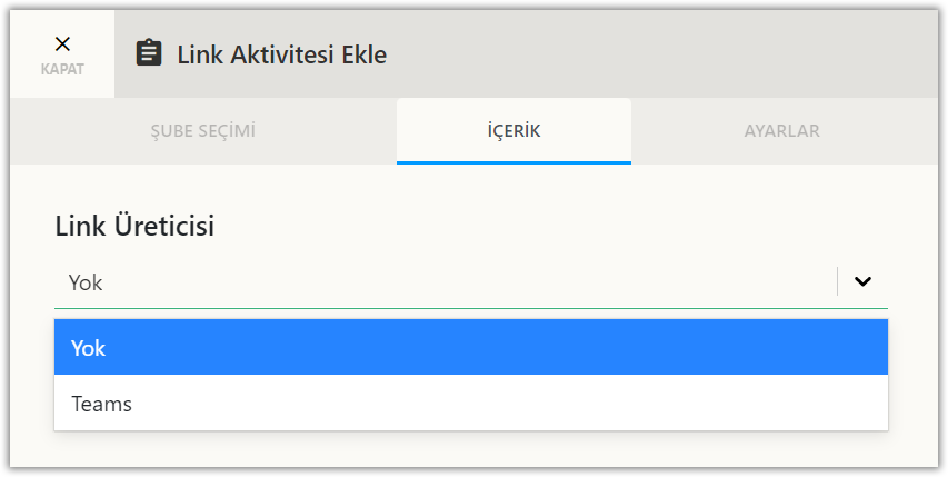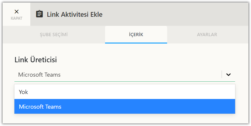 | Link aktivitesi Microsoft teams toplantısı ekleme penceresinde şube seçimi, içerik ve ayarlar sekmeleri bulunur. Microsoft Teams toplantısı oluşturmadan aktivite ayarlarına erişemezsiniz. Link aktivitesi Microsoft teams toplantısı içerik sekmesinde; * URL bağlantısı toplantı oluşturduğunuzda otomatik eklenir. * Aktivite ismi toplantı oluşturduğunuzda otomatik eklenir. * Aktivite açıklaması toplantı oluşturduğunuzda otomatik eklenir. * Zamanlama bölümünde yeni ekleyeceğiniz aktivitenin görünürlüğünü haftaya göre (Hafta Seçimi), tarihe göre (Tarih Seçimi) ve aktivite bitirme durumuna (Aktivite ve Saat Seçimi) göre seçin. * Aktivite bitirme kriteri bölümünde aktivitenin tamamlanma durumunu görüntüleme olarak seçin. * Devam Et düğmesine tıklayın. Ayarlar sekmesine geçiş yaptınız. |
